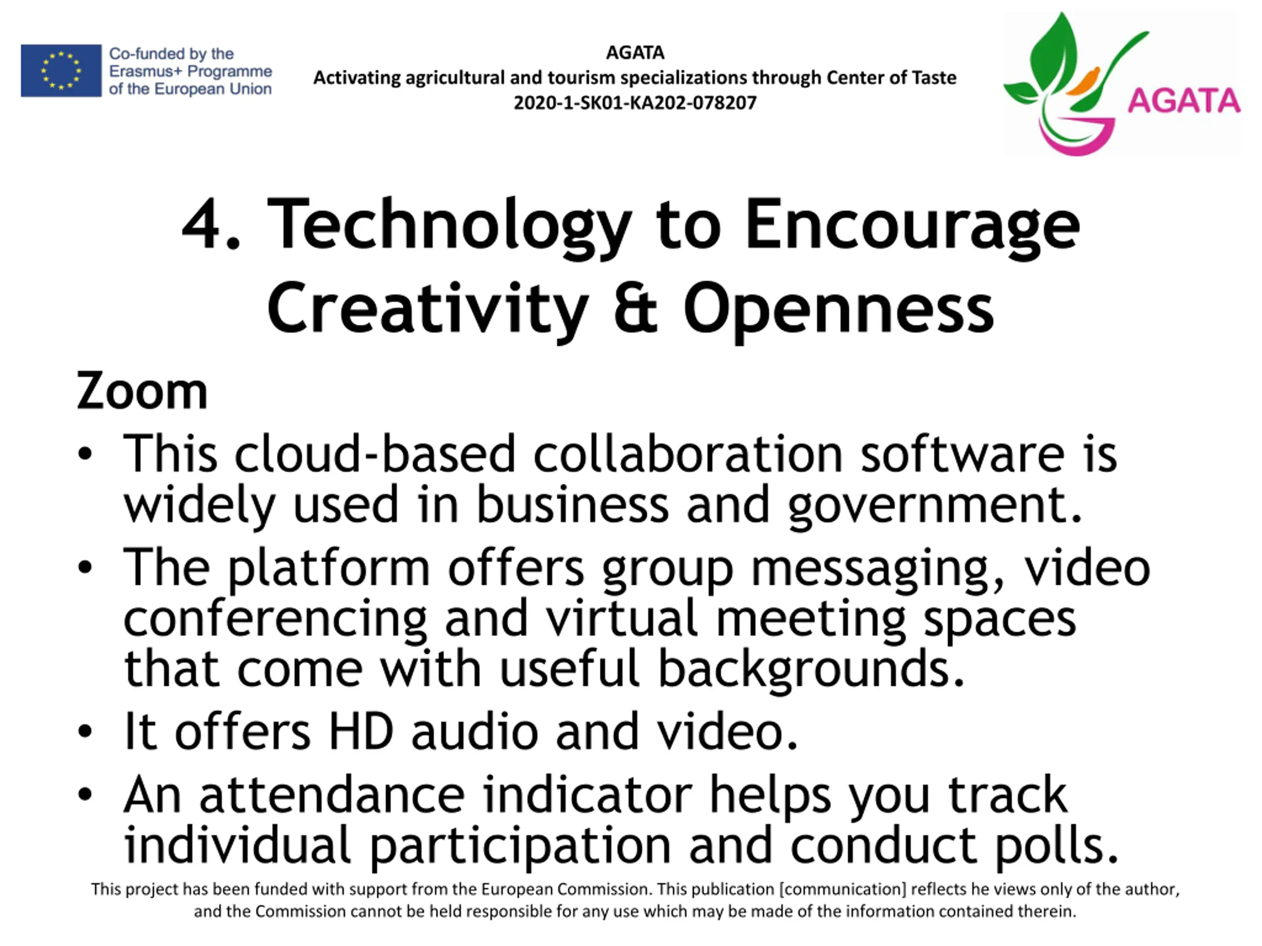 AGATA Activating agricultural and tourism specializations through Center of Taste 2020-1-SK01-KA202-078207 4. Technology to Encourage Creativity & Openness Zoom This cloud-based collaboration software is widely used in business and government. The platform offers group messaging, video conferencing and virtual meeting spaces that come with useful backgrounds. It offers HD audio and video. An attendance indicator helps you track individual participation and conduct polls. This project has been funded with support from the European Commission. This publication [communication] reflects he views only of the author, and the Commission cannot be held responsible for any use which may be made of the information contained therein.