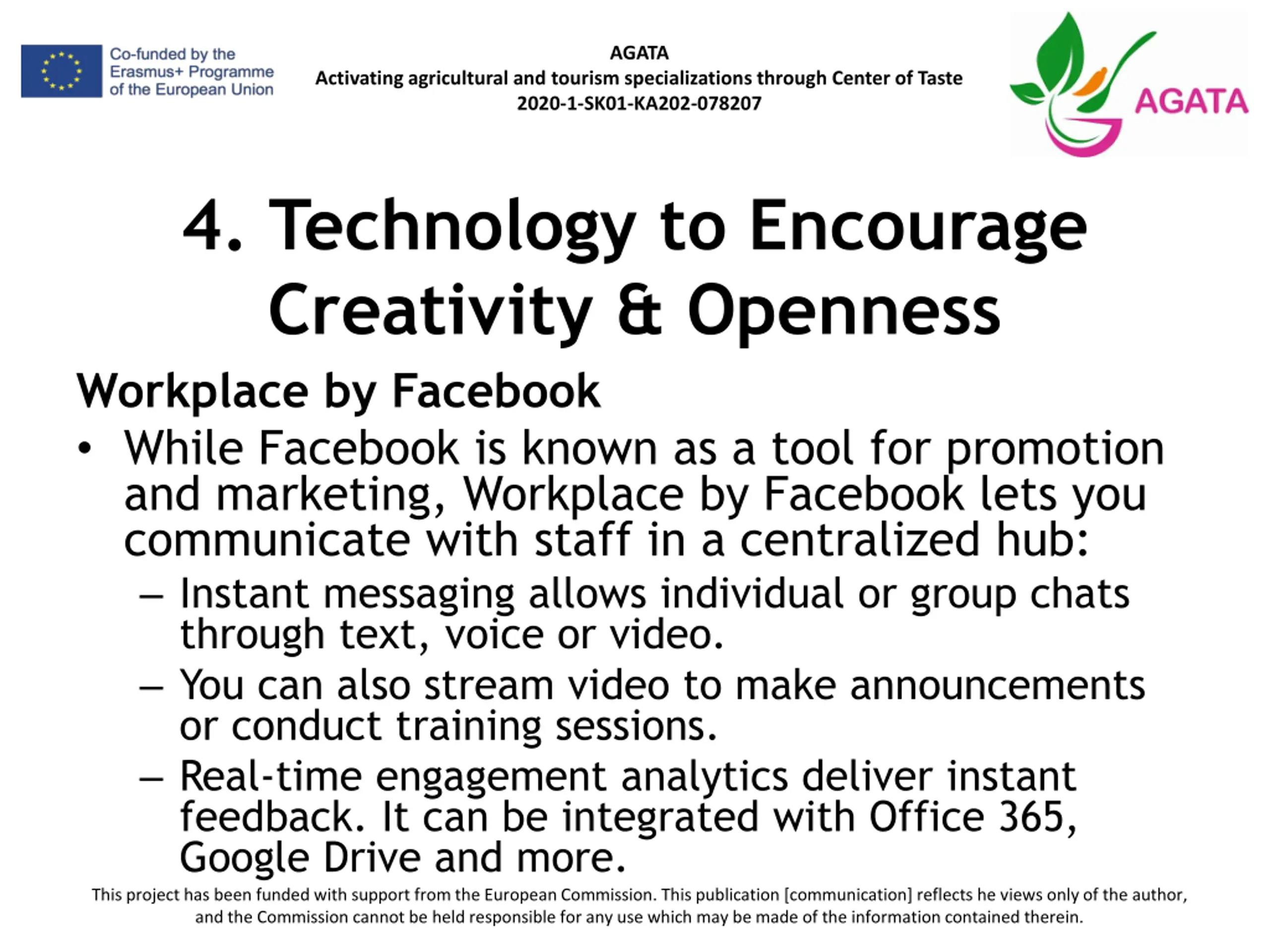 AGATA Activating agricultural and tourism specializations through Center of Taste 2020-1-SK01-KA202-078207 4. Technology to Encourage Creativity & Openness Workplace by Facebook While Facebook is known as a tool for promotion and marketing, Workplace by Facebook lets you communicate with staff in a centralized hub: Instant messaging allows individual or group chats through text, voice or video. You can also stream video to make announcements or conduct training sessions. Real-time engagement analytics deliver instant feedback. It can be integrated with Office 365, Google Drive and more. This project has been funded with support from the European Commission. This publication [communication] reflects he views only of the author, and the Commission cannot be held responsible for any use which may be made of the information contained therein.
