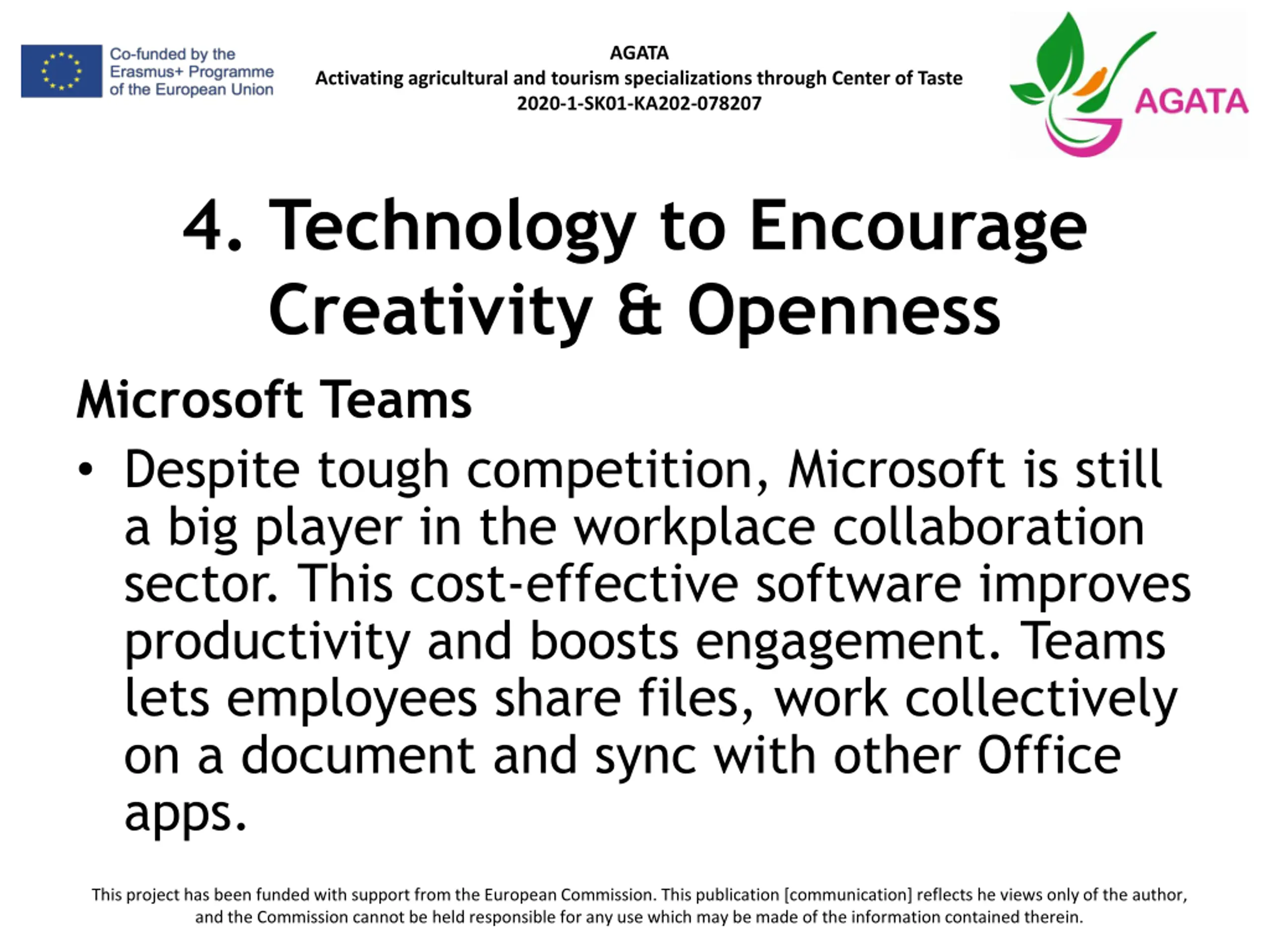 AGATA Activating agricultural and tourism specializations through Center of Taste 2020-1-SK01-KA202-078207 4. Technology to Encourage Creativity & Openness Microsoft Teams Despite tough competition, Microsoft is still a big player in the workplace collaboration sector. This cost-effective software improves productivity and boosts engagement. Teams lets employees share files, work collectively on a document and sync with other Office apps. This project has been funded with support from the European Commission. This publication [communication] reflects he views only of the author, and the Commission cannot be held responsible for any use which may be made of the information contained therein.