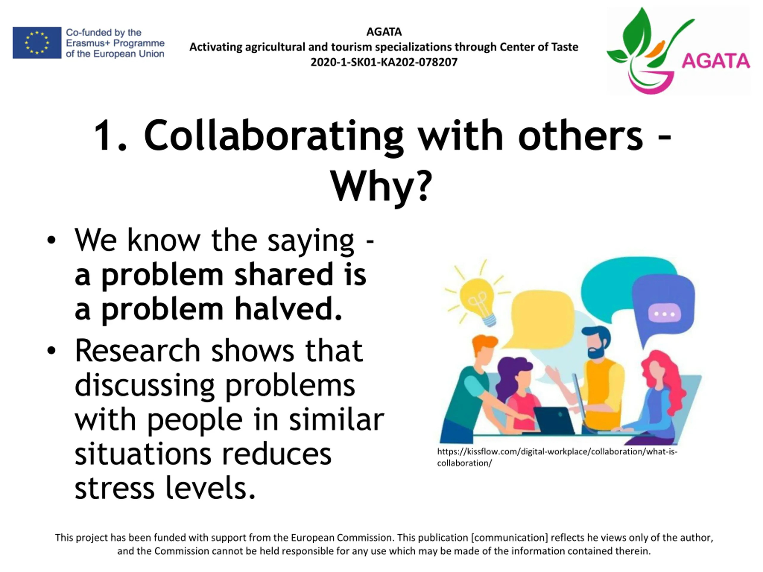 AGATA Activating agricultural and tourism specializations through Center of Taste 2020-1-SK01-KA202-078207 1. Collaborating with others Why? We know the saying - a problem shared is a problem halved. Research shows that discussing problems with people in similar situations reduces stress levels. https://kissflow.com/digital-workplace/collaboration/what-is- collaboration/ This project has been funded with support from the European Commission. This publication [communication] reflects he views only of the author, and the Commission cannot be held responsible for any use which may be made of the information contained therein.