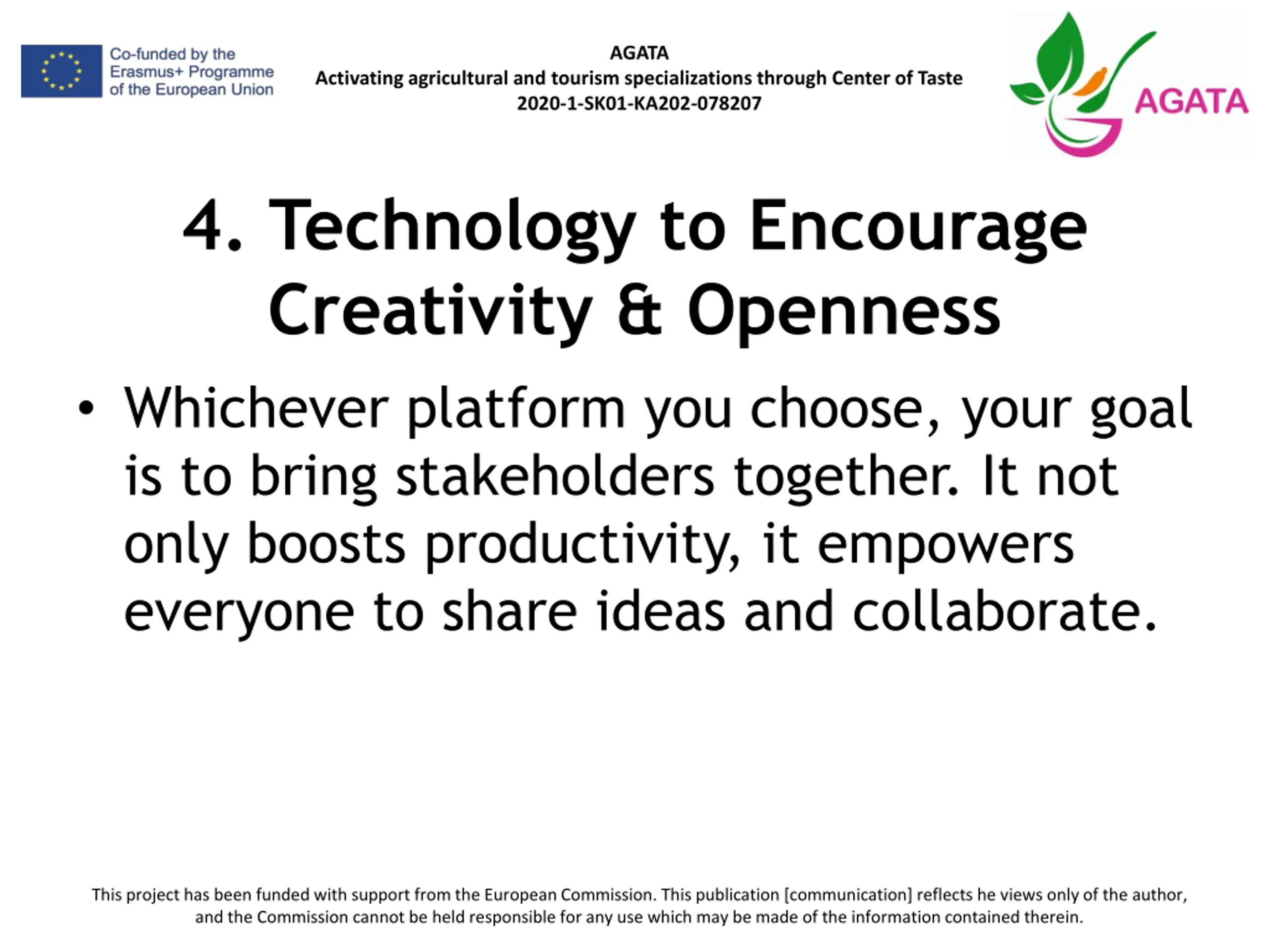 AGATA Activating agricultural and tourism specializations through Center of Taste 2020-1-SK01-KA202-078207 4. Technology to Encourage Creativity & Openness Whichever platform you choose, your goal is to bring stakeholders together. It not only boosts productivity, it empowers everyone to share ideas and collaborate. This project has been funded with support from the European Commission. This publication [communication] reflects he views only of the author, and the Commission cannot be held responsible for any use which may be made of the information contained therein.