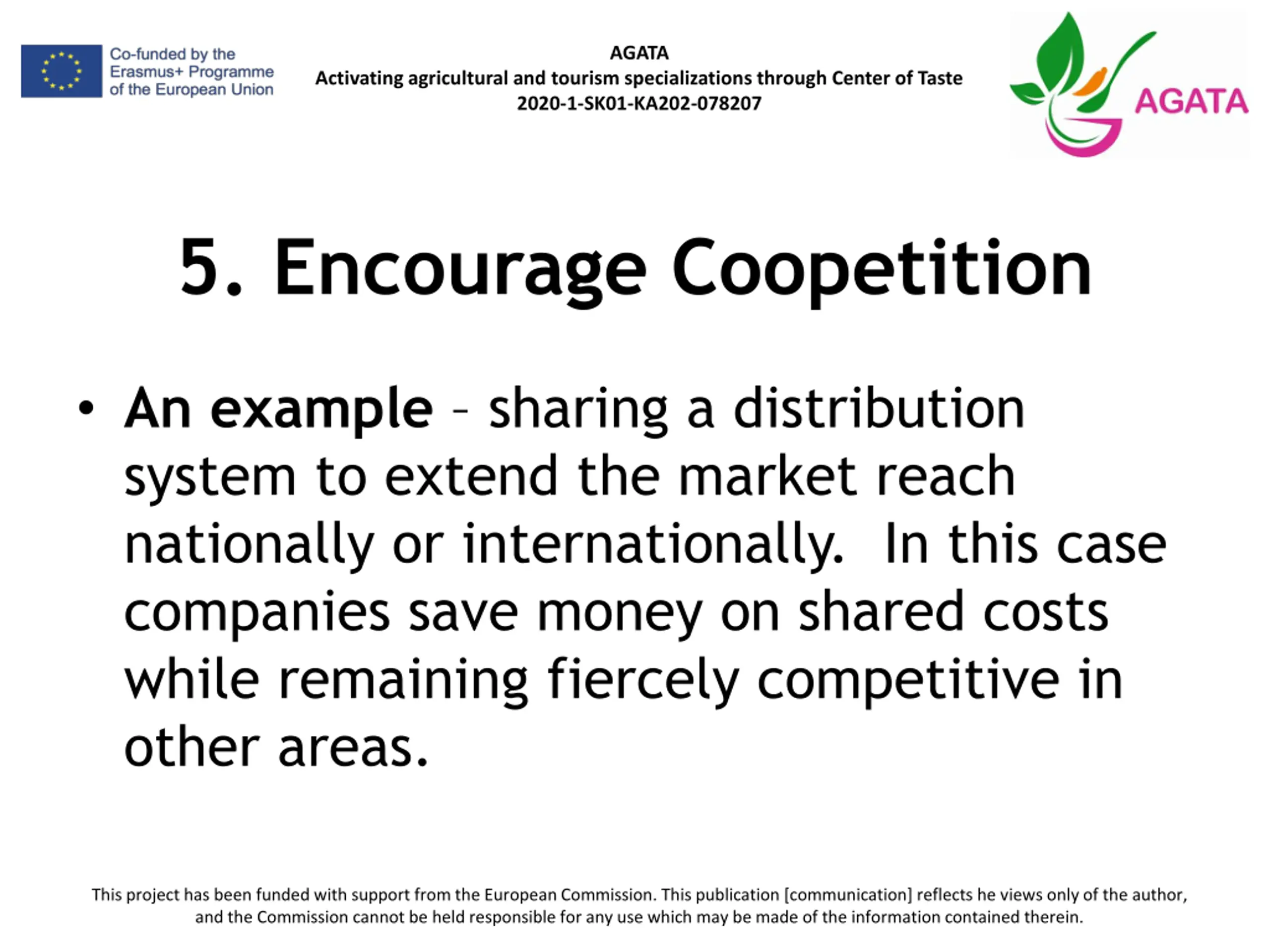 AGATA Activating agricultural and tourism specializations through Center of Taste 2020-1-SK01-KA202-078207 5. Encourage Coopetition An example sharing a distribution system to extend the market reach nationally or internationally. In this case companies save money on shared costs while remaining fiercely competitive in other areas. This project has been funded with support from the European Commission. This publication [communication] reflects he views only of the author, and the Commission cannot be held responsible for any use which may be made of the information contained therein.