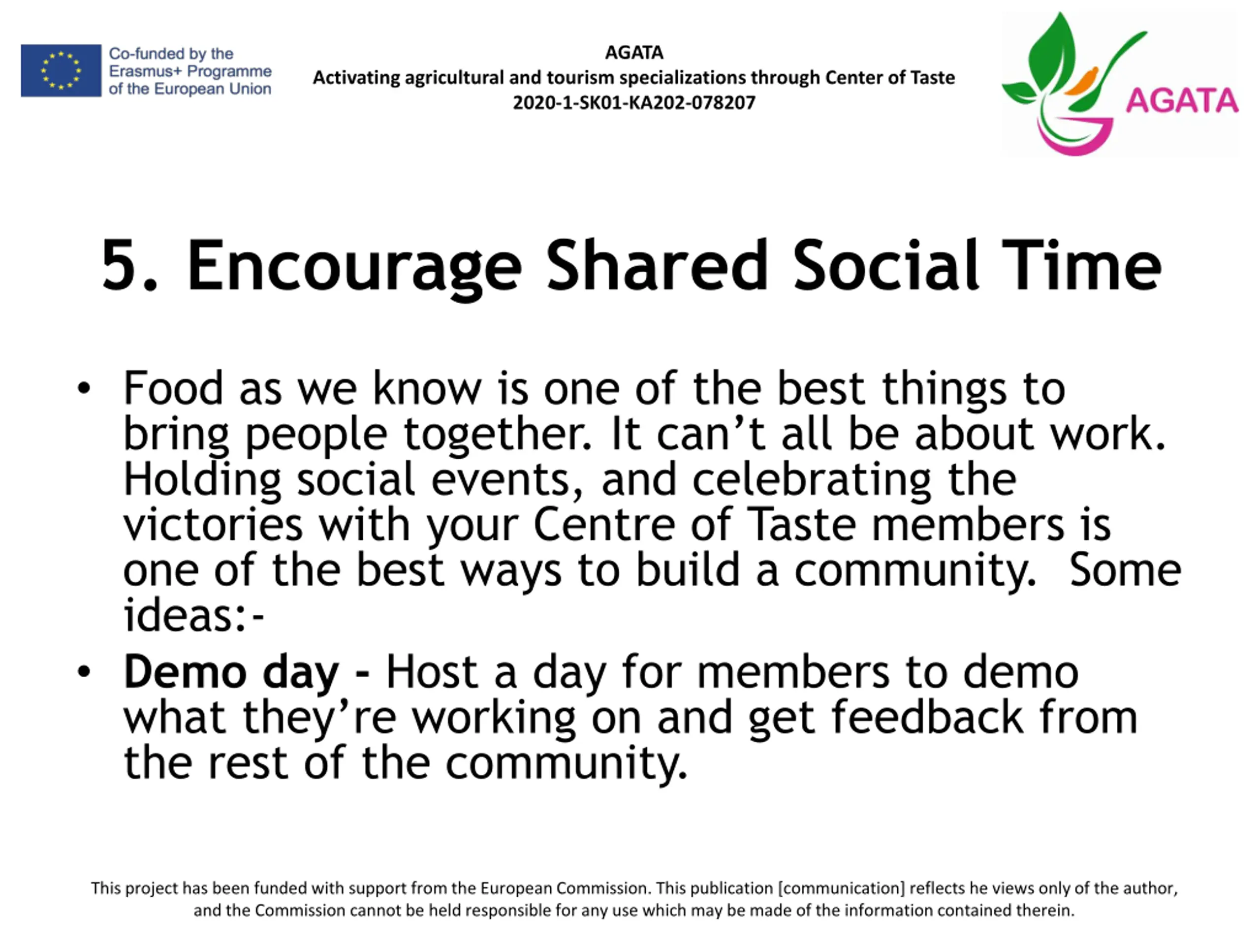 AGATA Activating agricultural and tourism specializations through Center of Taste 2020-1-SK01-KA202-078207 5. Encourage Shared Social Time Food as we know is one of the best things to bring people together. It can t all be about work. Holding social events, and celebrating the victories with your Centre of Taste members is one of the best ways to build a community. Some ideas:- Demo day - Host a day for members to demo what they re working on and get feedback from the rest of the community. This project has been funded with support from the European Commission. This publication [communication] reflects he views only of the author, and the Commission cannot be held responsible for any use which may be made of the information contained therein.