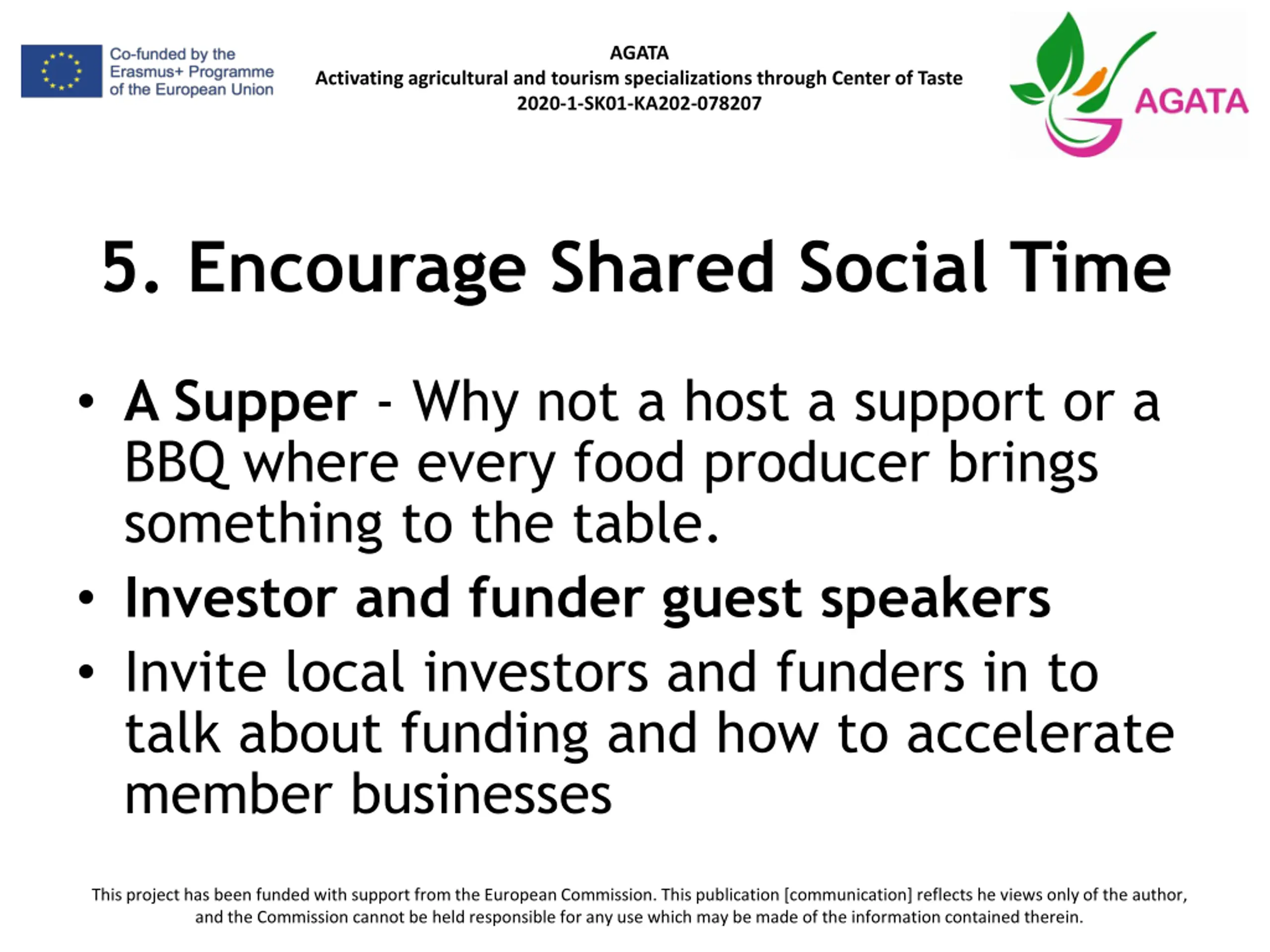AGATA Activating agricultural and tourism specializations through Center of Taste 2020-1-SK01-KA202-078207 5. Encourage Shared Social Time A Supper - Why not a host a support or a BBQ where every food producer brings something to the table. Investor and funder guest speakers Invite local investors and funders in to talk about funding and how to accelerate member businesses This project has been funded with support from the European Commission. This publication [communication] reflects he views only of the author, and the Commission cannot be held responsible for any use which may be made of the information contained therein.