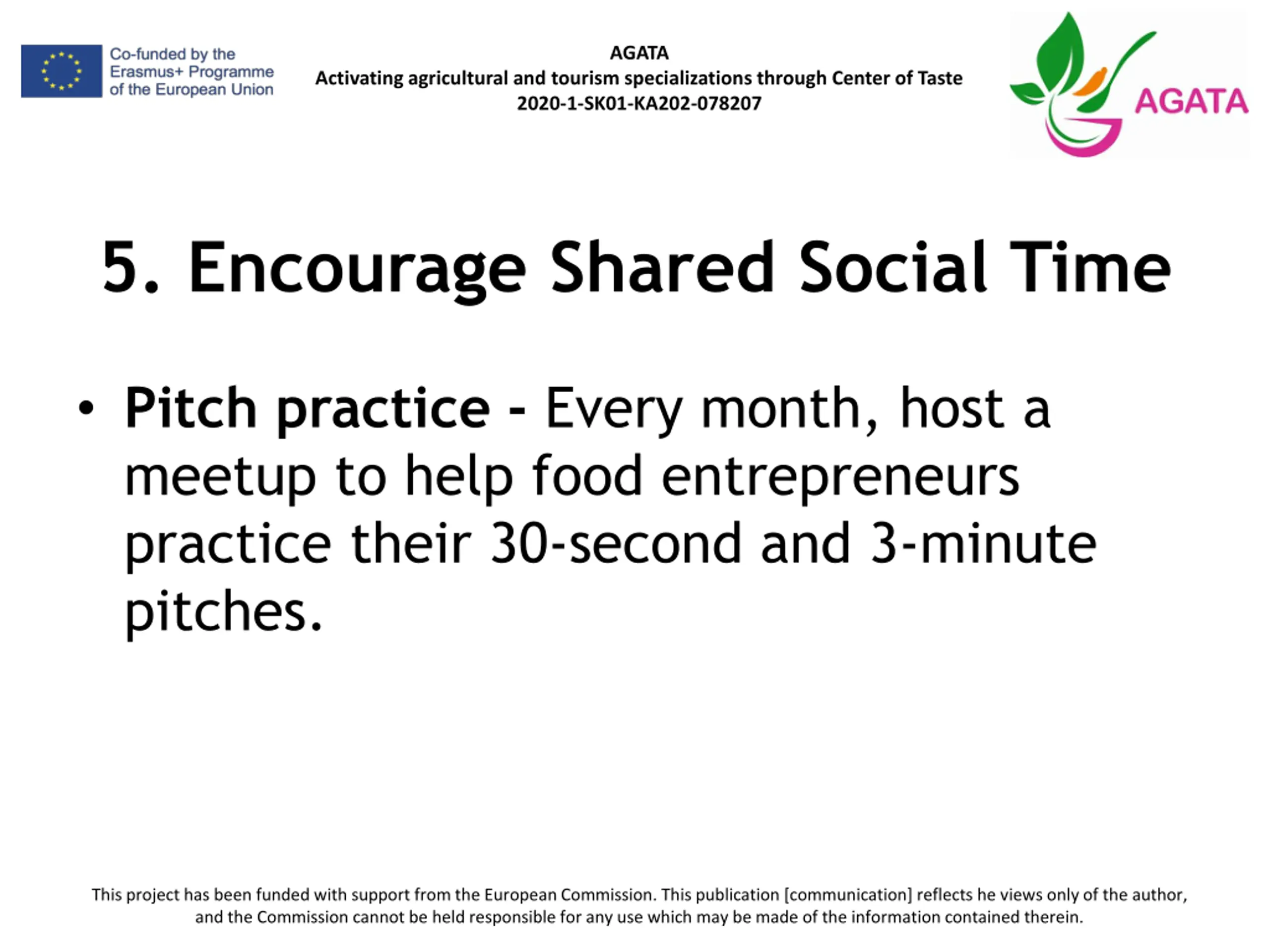 AGATA Activating agricultural and tourism specializations through Center of Taste 2020-1-SK01-KA202-078207 5. Encourage Shared Social Time Pitch practice - Every month, host a meetup to help food entrepreneurs practice their 30-second and 3-minute pitches. This project has been funded with support from the European Commission. This publication [communication] reflects he views only of the author, and the Commission cannot be held responsible for any use which may be made of the information contained therein.