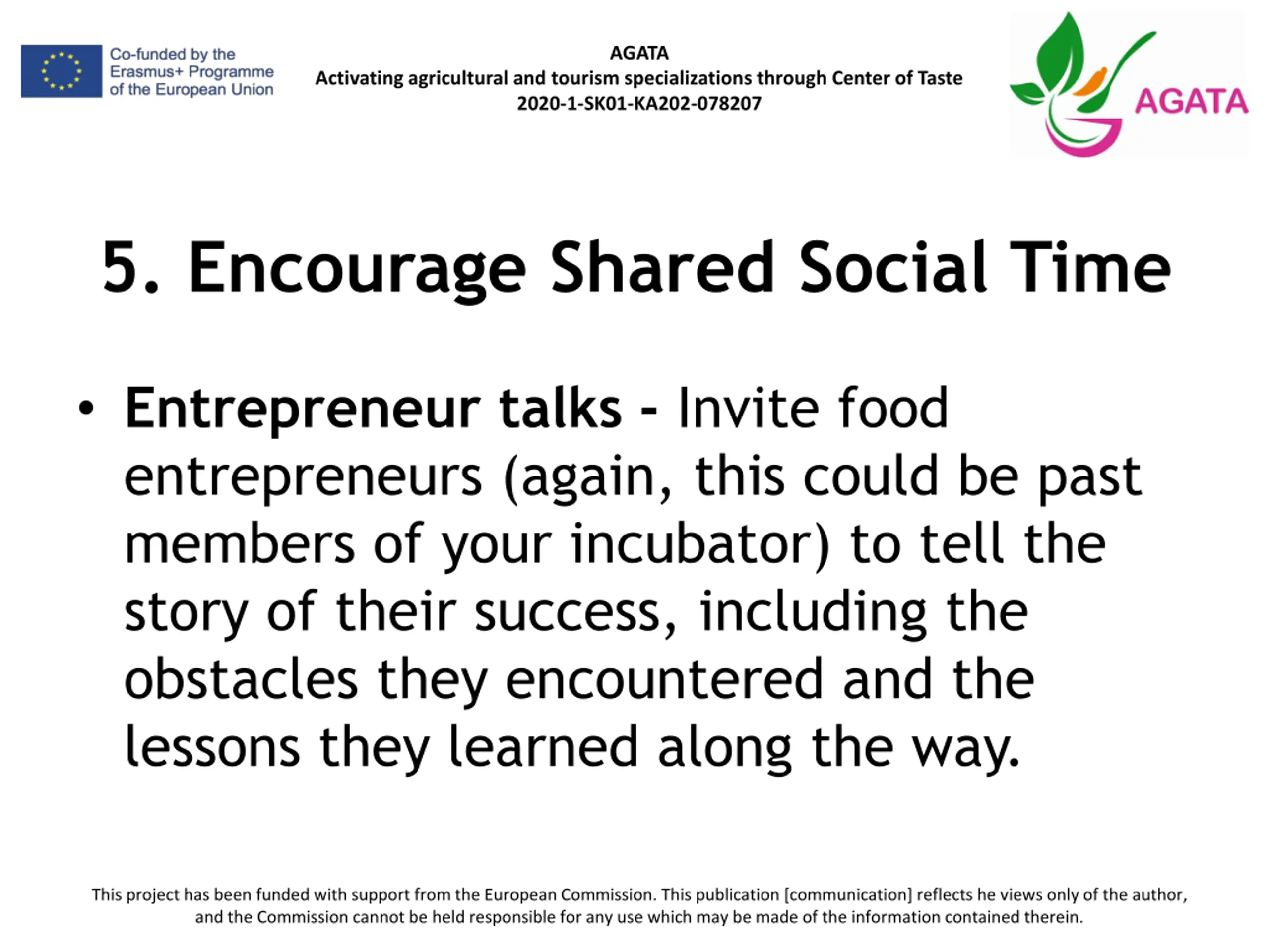AGATA Activating agricultural and tourism specializations through Center of Taste 2020-1-SK01-KA202-078207 5. Encourage Shared Social Time Entrepreneur talks - Invite food entrepreneurs (again, this could be past members of your incubator) to tell the story of their success, including the obstacles they encountered and the lessons they learned along the way. This project has been funded with support from the European Commission. This publication [communication] reflects he views only of the author, and the Commission cannot be held responsible for any use which may be made of the information contained therein.