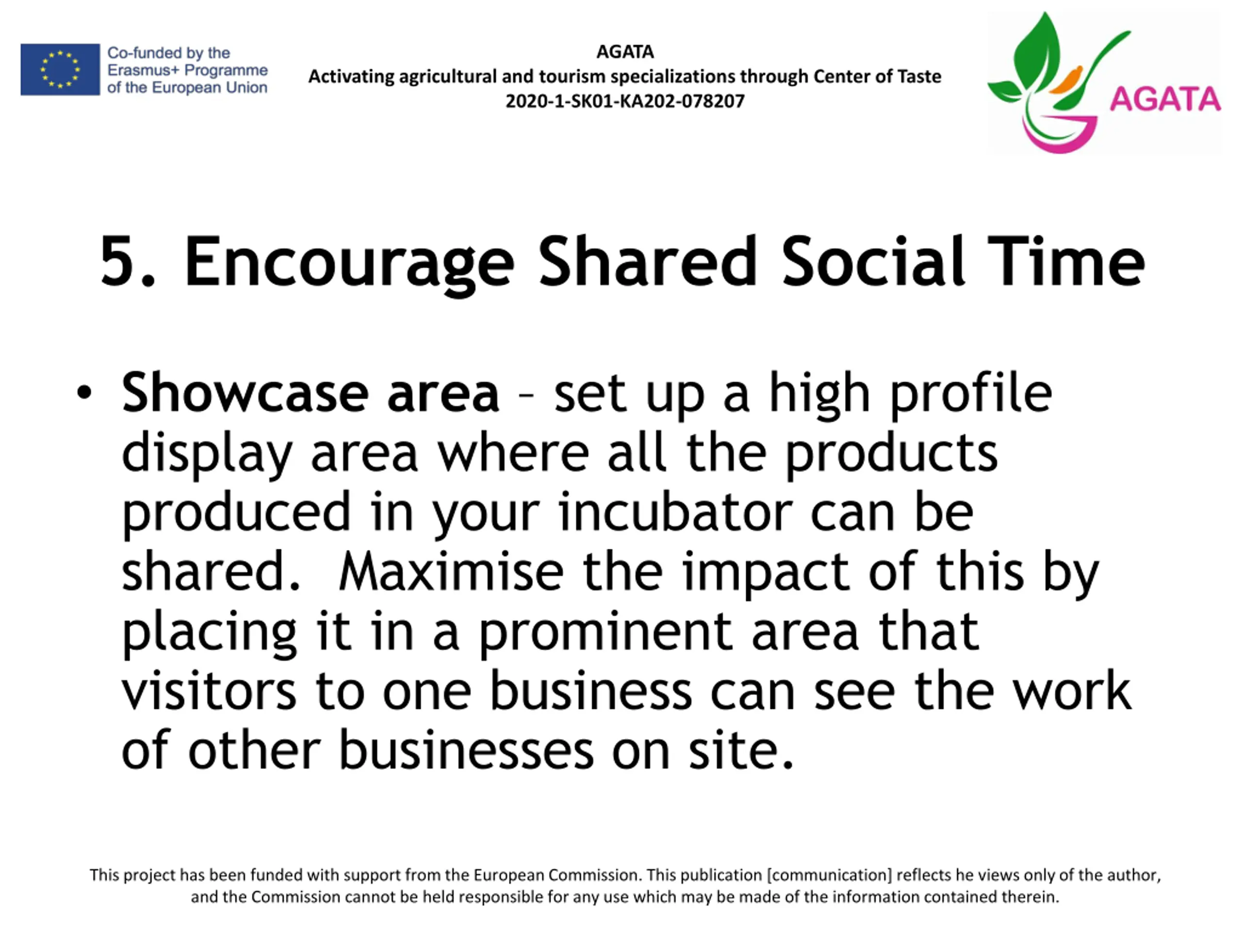 AGATA Activating agricultural and tourism specializations through Center of Taste 2020-1-SK01-KA202-078207 5. Encourage Shared Social Time Showcase area set up a high profile display area where all the products produced in your incubator can be shared. Maximise the impact of this by placing it in a prominent area that visitors to one business can see the work of other businesses on site. This project has been funded with support from the European Commission. This publication [communication] reflects he views only of the author, and the Commission cannot be held responsible for any use which may be made of the information contained therein.