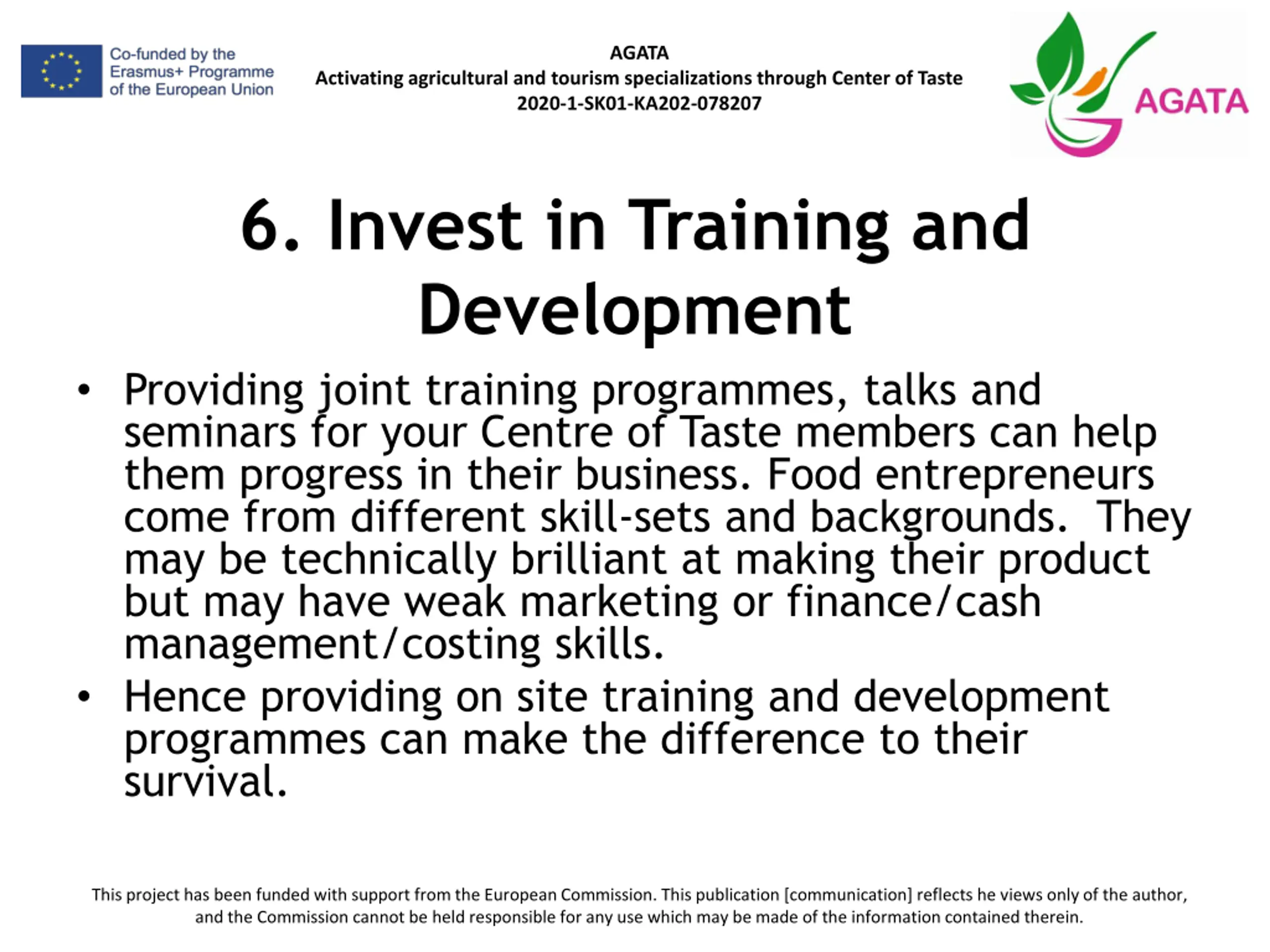 AGATA Activating agricultural and tourism specializations through Center of Taste 2020-1-SK01-KA202-078207 6. Invest in Training and Development Providing joint training programmes, talks and seminars for your Centre of Taste members can help them progress in their business. Food entrepreneurs come from different skill-sets and backgrounds. They may be technically brilliant at making their product but may have weak marketing or finance/cash management/costing skills. Hence providing on site training and development programmes can make the difference to their survival. This project has been funded with support from the European Commission. This publication [communication] reflects he views only of the author, and the Commission cannot be held responsible for any use which may be made of the information contained therein.