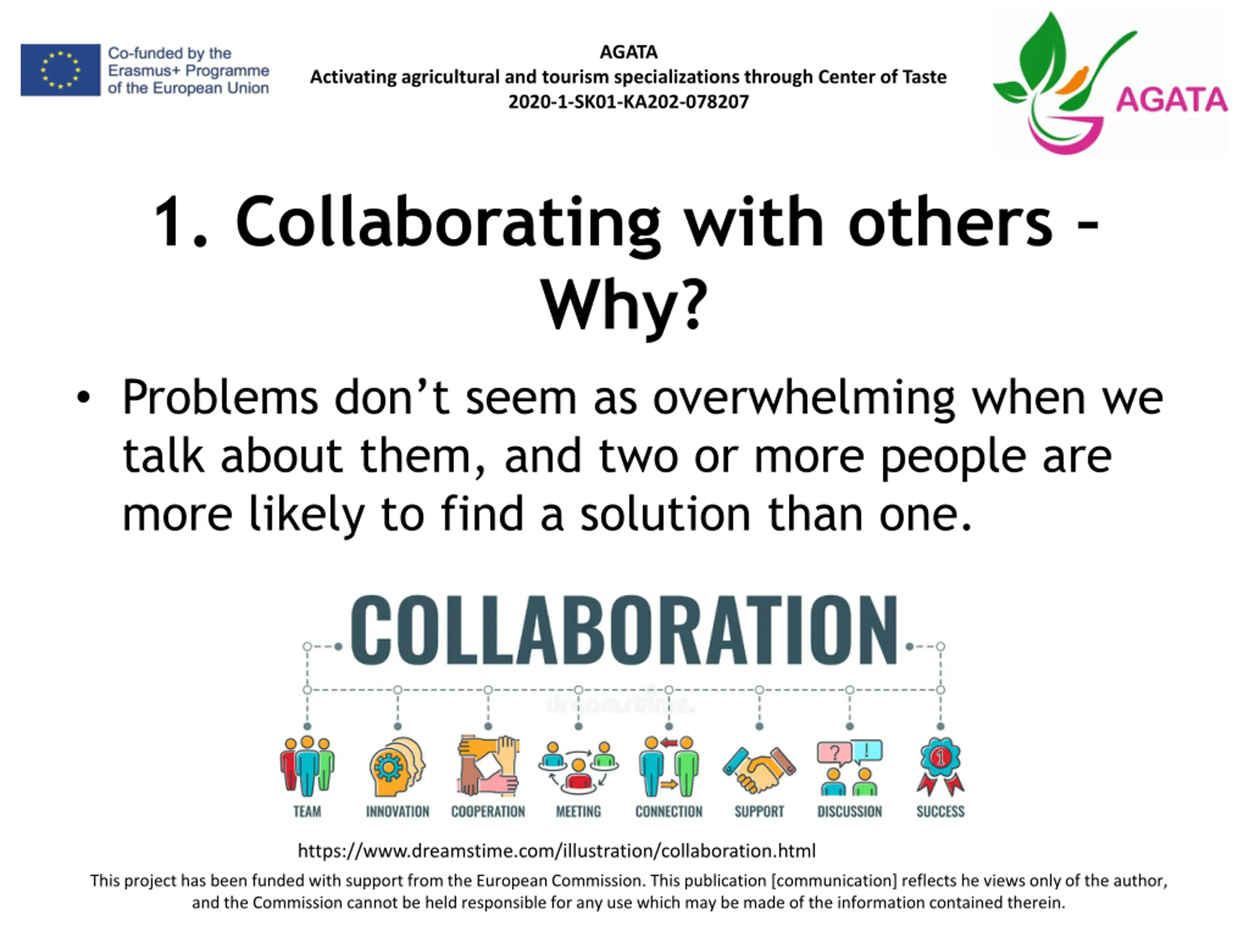 AGATA Activating agricultural and tourism specializations through Center of Taste 2020-1-SK01-KA202-078207 1. Collaborating with others Why? Problems don t seem as overwhelming when we talk about them, and two or more people are more likely to find a solution than one. https://www.dreamstime.com/illustration/collaboration.html This project has been funded with support from the European Commission. This publication [communication] reflects he views only of the author, and the Commission cannot be held responsible for any use which may be made of the information contained therein.