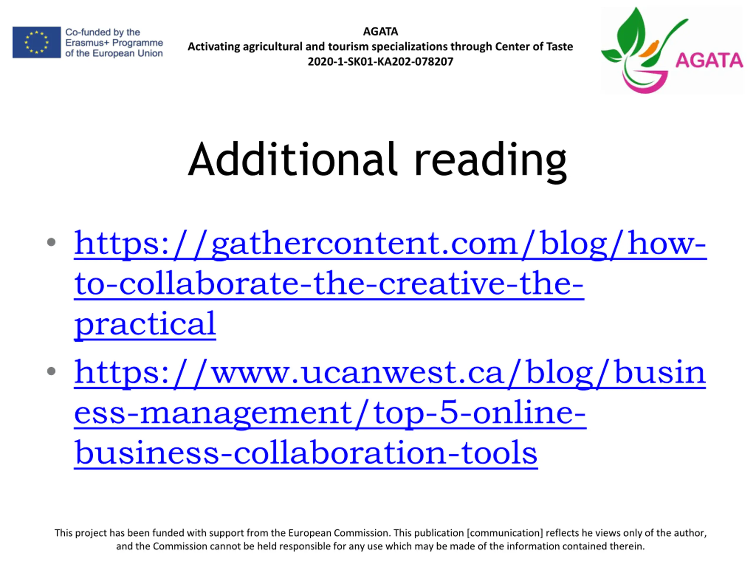 AGATA Activating agricultural and tourism specializations through Center of Taste 2020-1-SK01-KA202-078207 Additional reading https://gathercontent.com/blog/how- to-collaborate-the-creative-the- practical https://www.ucanwest.ca/blog/busin ess-management/top-5-online- business-collaboration-tools This project has been funded with support from the European Commission. This publication [communication] reflects he views only of the author, and the Commission cannot be held responsible for any use which may be made of the information contained therein.