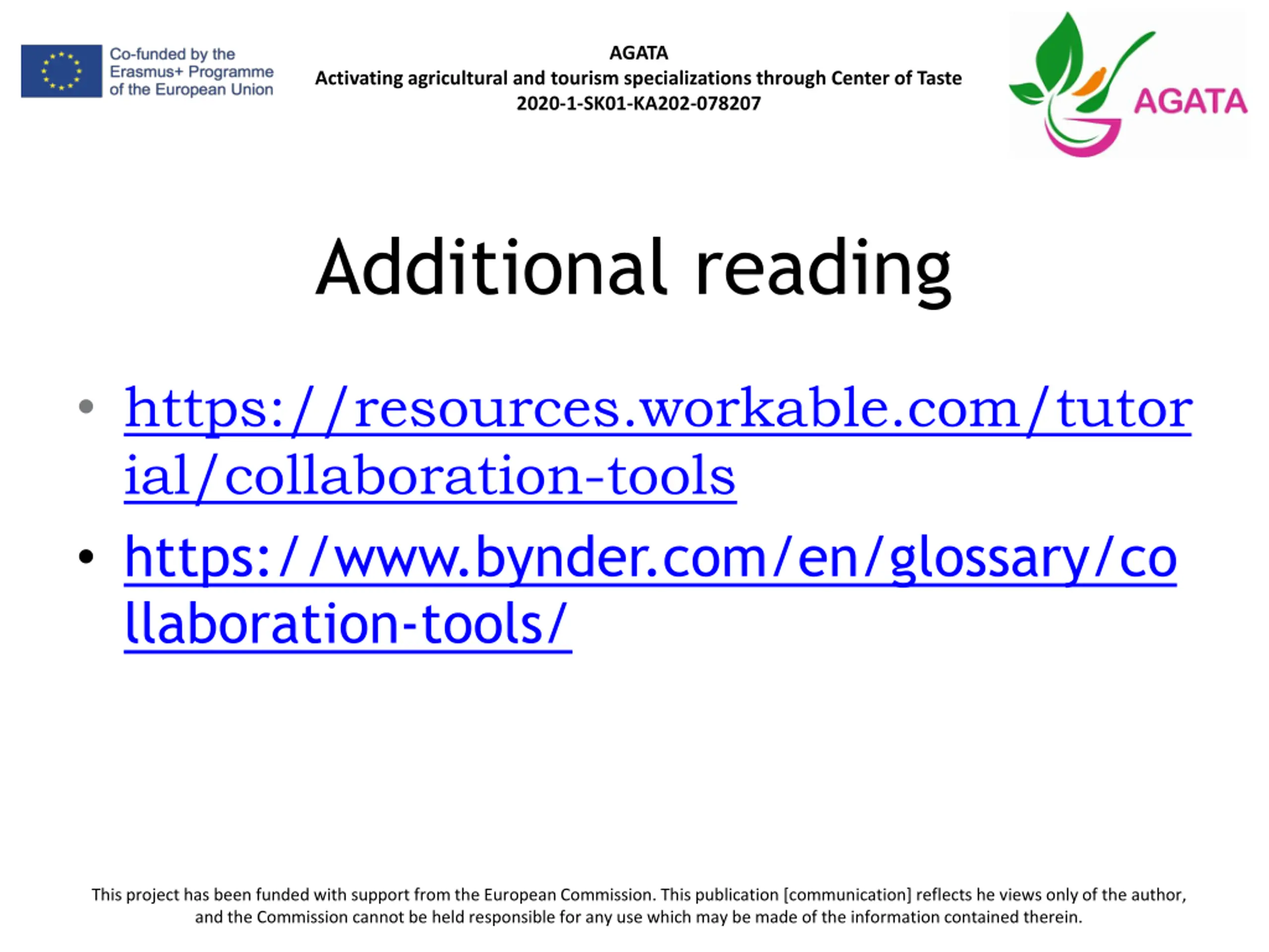 AGATA Activating agricultural and tourism specializations through Center of Taste 2020-1-SK01-KA202-078207 Additional reading https://resources.workable.com/tutor ial/collaboration-tools https://www.bynder.com/en/glossary/co llaboration-tools/ This project has been funded with support from the European Commission. This publication [communication] reflects he views only of the author, and the Commission cannot be held responsible for any use which may be made of the information contained therein.