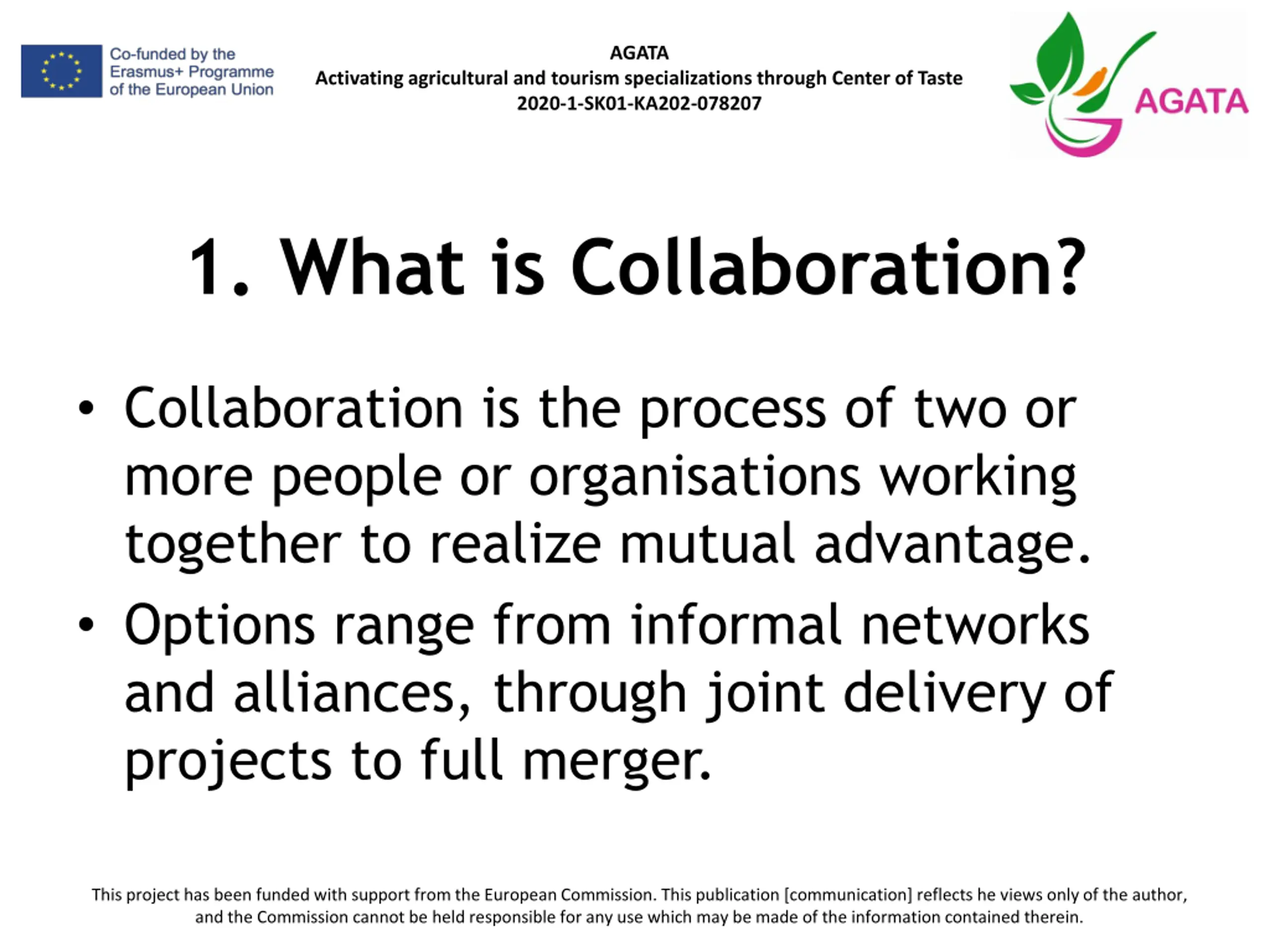 AGATA Activating agricultural and tourism specializations through Center of Taste 2020-1-SK01-KA202-078207 1. What is Collaboration? Collaboration is the process of two or more people or organisations working together to realize mutual advantage. Options range from informal networks and alliances, through joint delivery of projects to full merger. This project has been funded with support from the European Commission. This publication [communication] reflects he views only of the author, and the Commission cannot be held responsible for any use which may be made of the information contained therein.