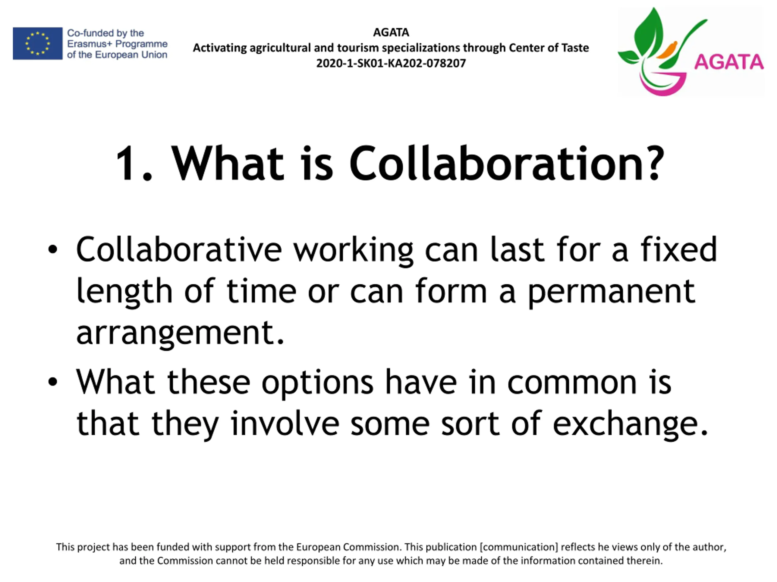 AGATA Activating agricultural and tourism specializations through Center of Taste 2020-1-SK01-KA202-078207 1. What is Collaboration? Collaborative working can last for a fixed length of time or can form a permanent arrangement. What these options have in common is that they involve some sort of exchange. This project has been funded with support from the European Commission. This publication [communication] reflects he views only of the author, and the Commission cannot be held responsible for any use which may be made of the information contained therein.