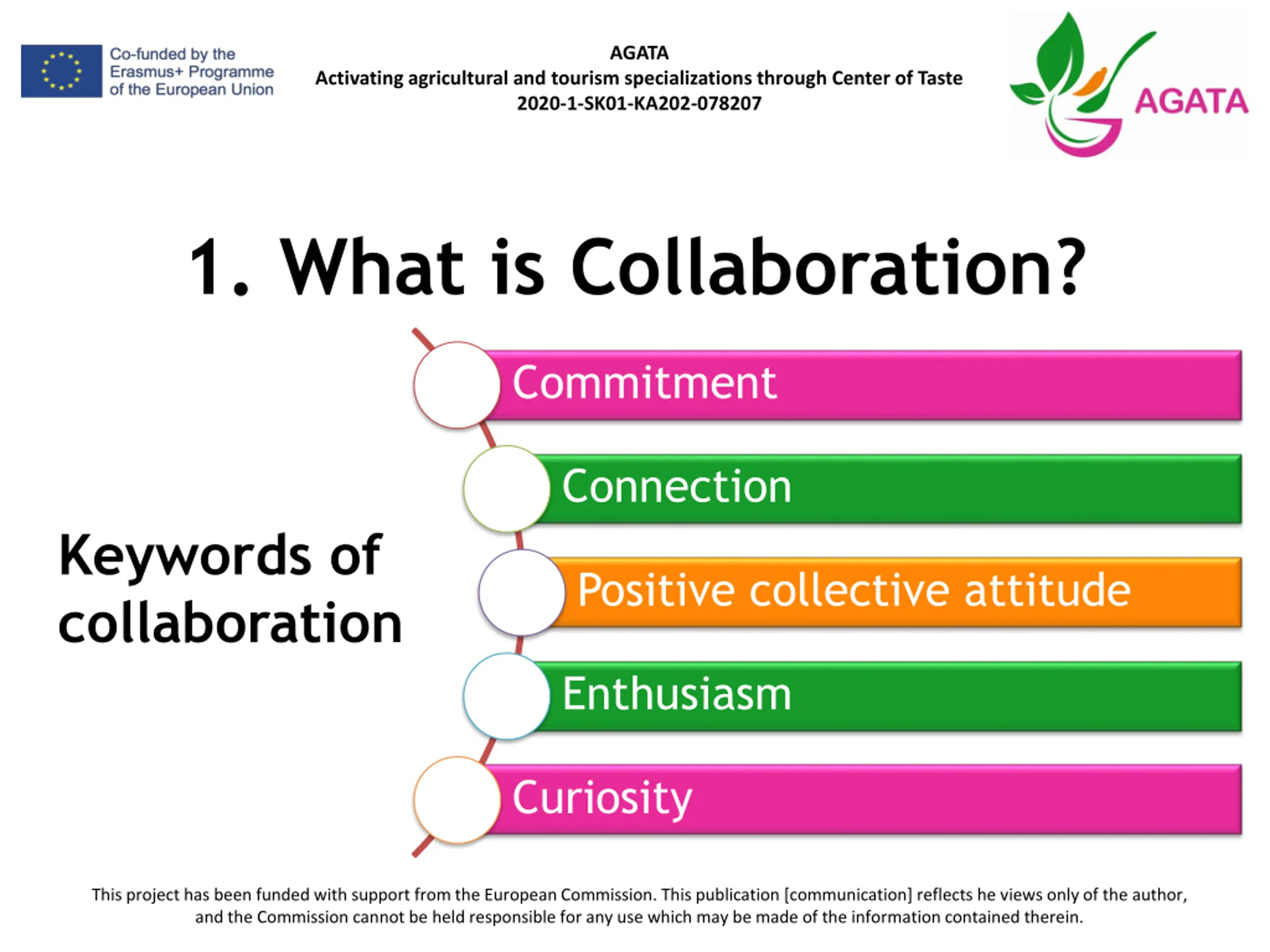 AGATA Activating agricultural and tourism specializations through Center of Taste 2020-1-SK01-KA202-078207 1. What is Collaboration? Commitment Connection Keywords of collaboration Positive collective attitude Enthusiasm Curiosity This project has been funded with support from the European Commission. This publication [communication] reflects he views only of the author, and the Commission cannot be held responsible for any use which may be made of the information contained therein.