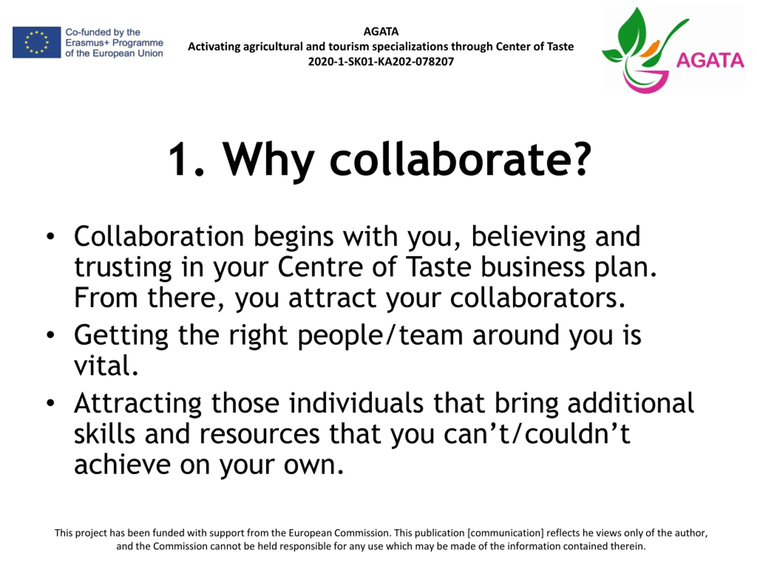 AGATA Activating agricultural and tourism specializations through Center of Taste 2020-1-SK01-KA202-078207 1. Why collaborate? Collaboration begins with you, believing and trusting in your Centre of Taste business plan. From there, you attract your collaborators. Getting the right people/team around you is vital. Attracting those individuals that bring additional skills and resources that you can t/couldn t achieve on your own. This project has been funded with support from the European Commission. This publication [communication] reflects he views only of the author, and the Commission cannot be held responsible for any use which may be made of the information contained therein.