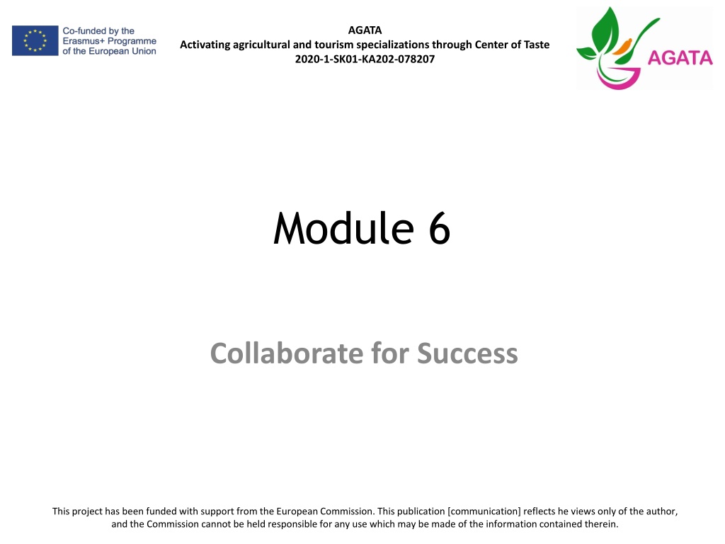 AGATA Activating agricultural and tourism specializations through Center of Taste 2020-1-SK01-KA202-078207 Module 6 Collaborate for Success This project has been funded with support from the European Commission. This publication [communication] reflects he views only of the author, and the Commission cannot be held responsible for any use which may be made of the information contained therein.