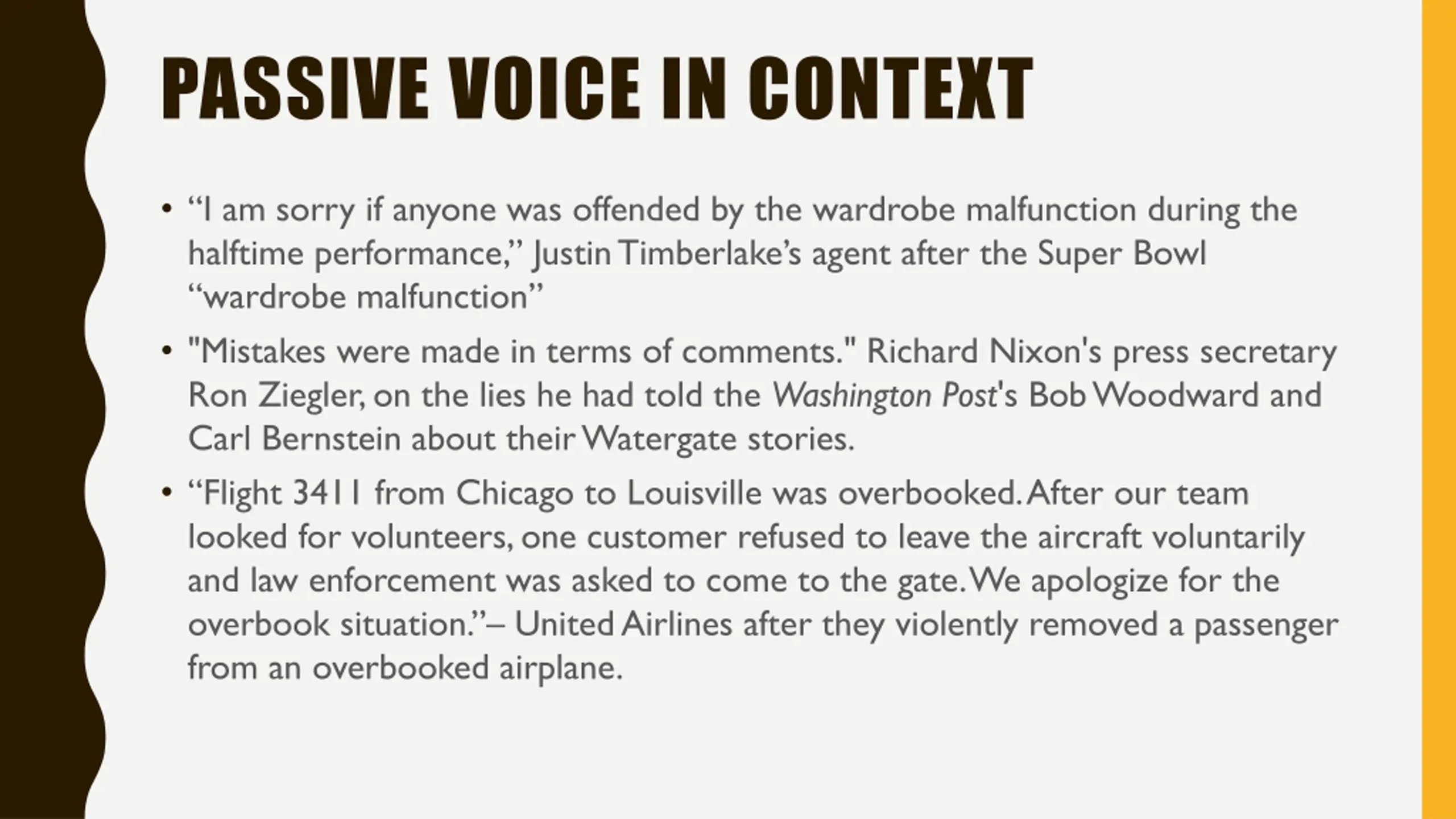 PASSIVE VOICE IN CONTEXT I am sorry if anyone was offended by the wardrobe malfunction during the halftime performance, Justin Timberlake s agent after the Super Bowl wardrobe malfunction "Mistakes were made in terms of comments." Richard Nixon's press secretary Ron Ziegler, on the lies he had told the Washington Post's Bob Woodward and Carl Bernstein about their Watergate stories. Flight 3411 from Chicago to Louisville was overbooked. After our team looked for volunteers, one customer refused to leave the aircraft voluntarily and law enforcement was asked to come to the gate. We apologize for the overbook situation. United Airlines after they violently removed a passenger from an overbooked airplane.