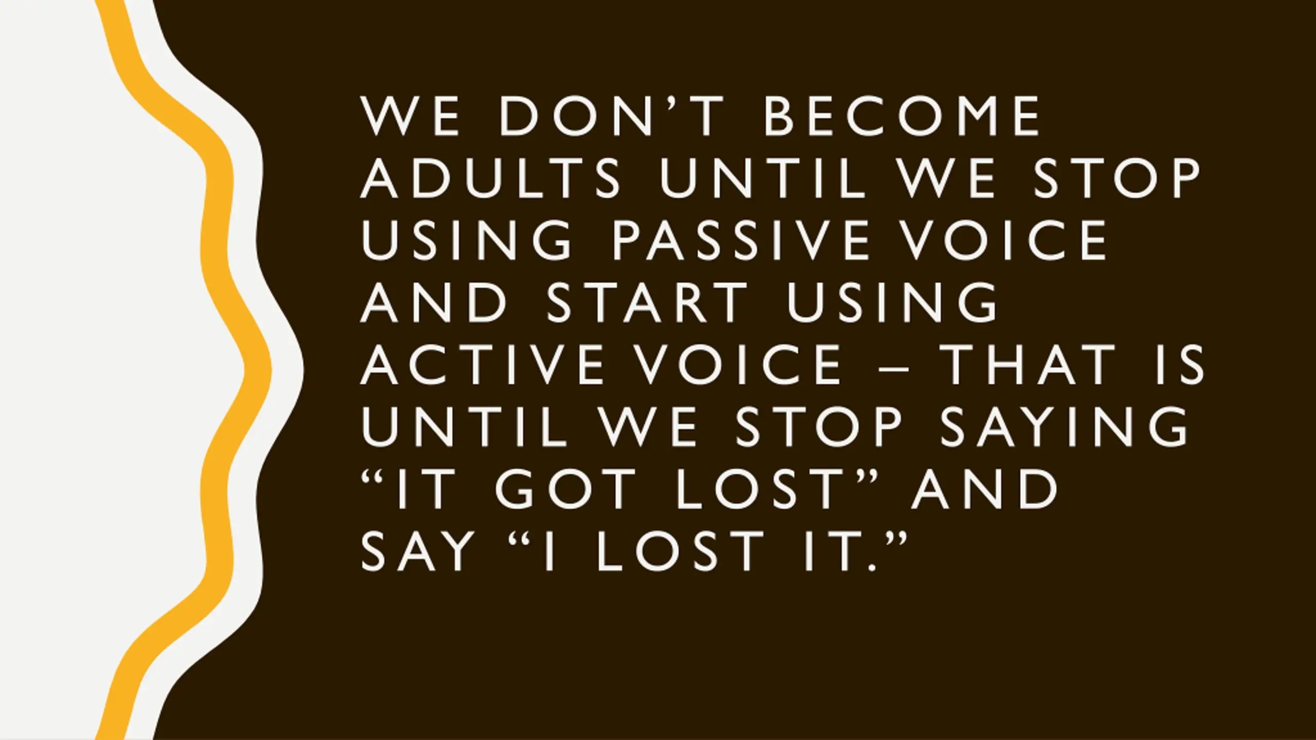 WE DONT BECOME ADULTS UNTIL WE STOP USING PASSIVE VOICE AND START USING ACTIVE VOICE THAT IS UNTIL WE STOP SAYING IT GOT LOST AND SAY I LOST IT.