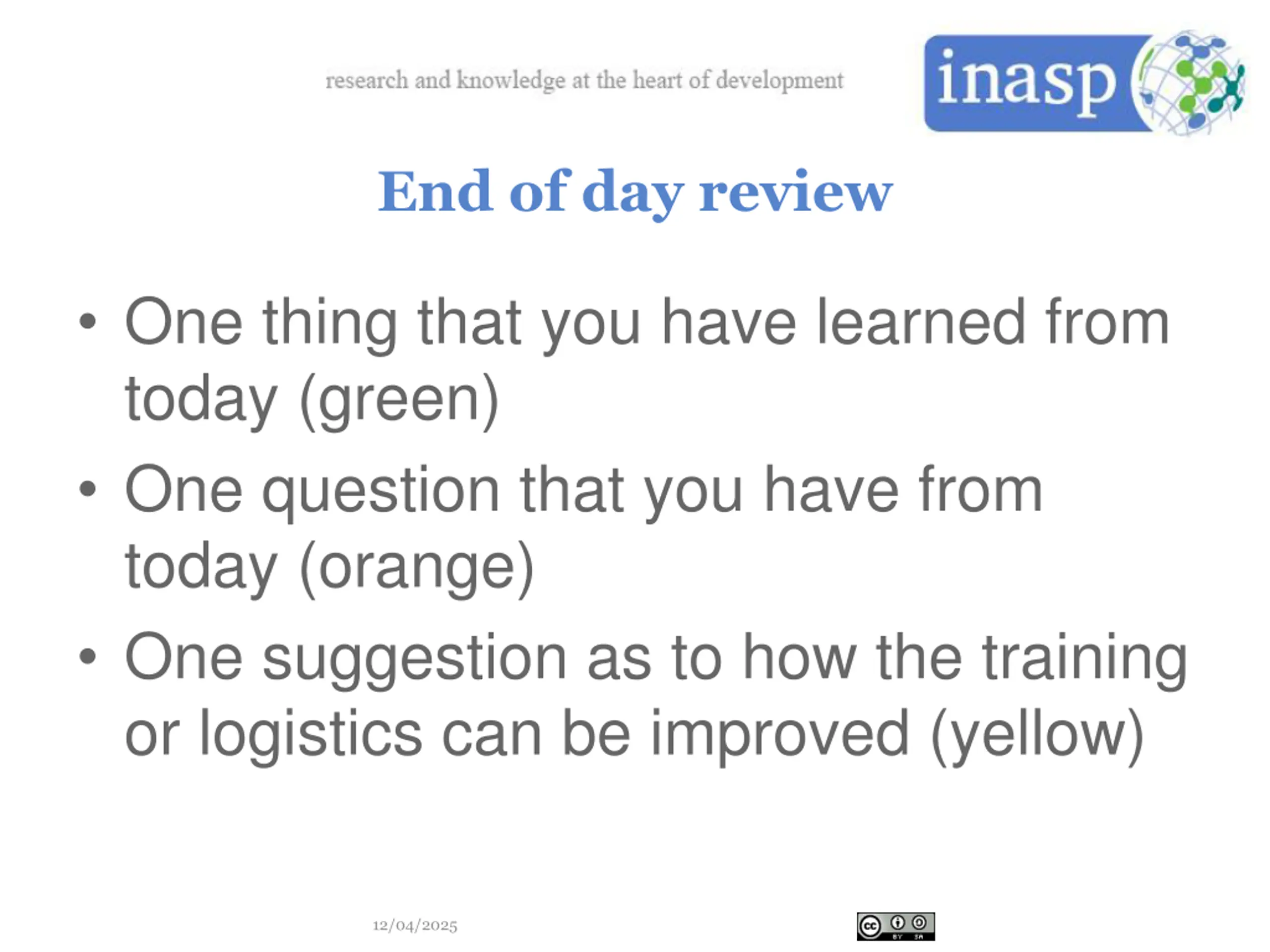 End of day review One thing that you have learned from today (green) One question that you have from today (orange) One suggestion as to how the training or logistics can be improved (yellow) 12/04/2025