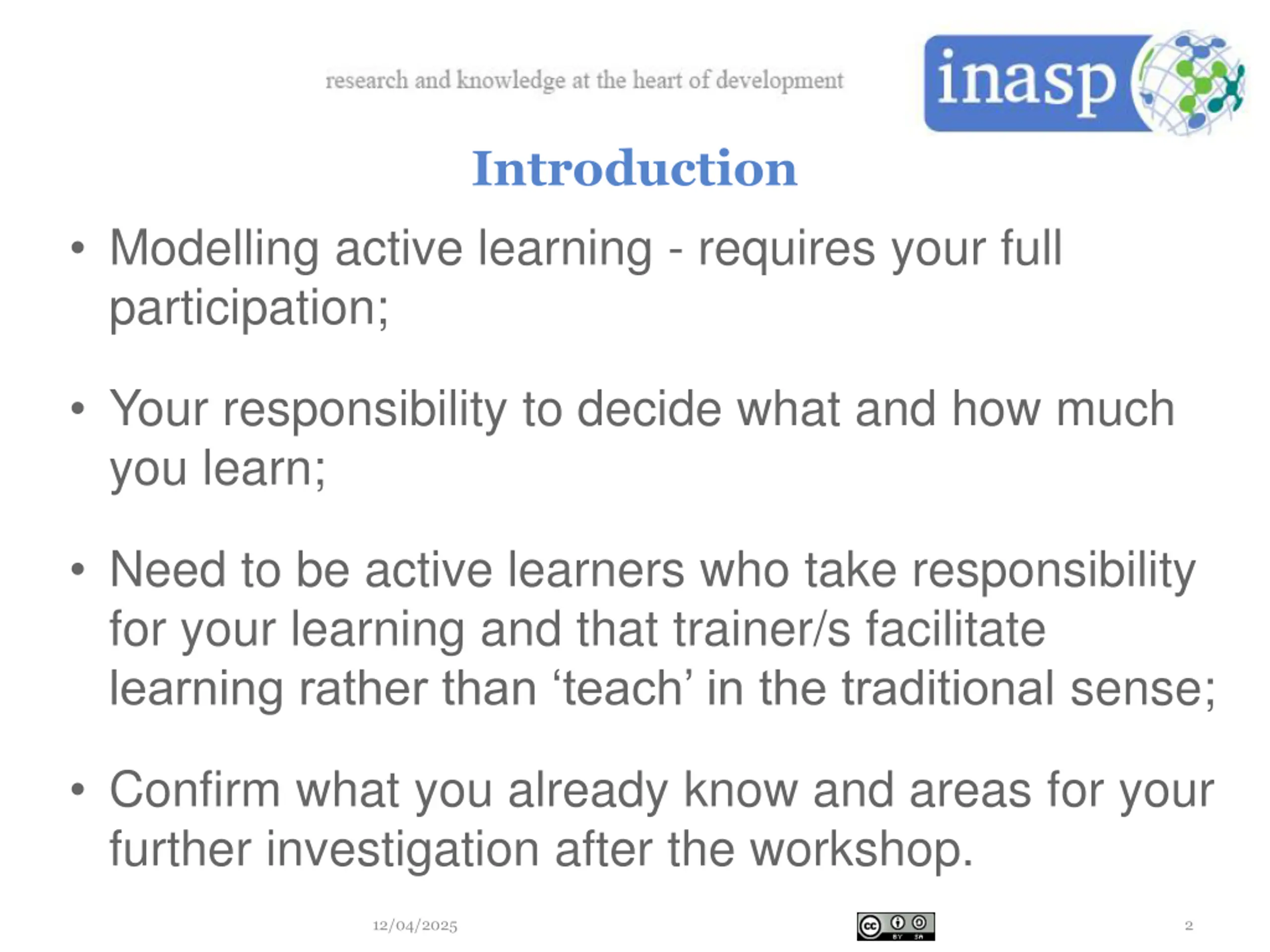 Introduction Modelling active learning - requires your full participation; Your responsibility to decide what and how much you learn; Need to be active learners who take responsibility for your learning and that trainer/s facilitate learning rather than teach in the traditional sense; Confirm what you already know and areas for your further investigation after the workshop. 12/04/2025 2