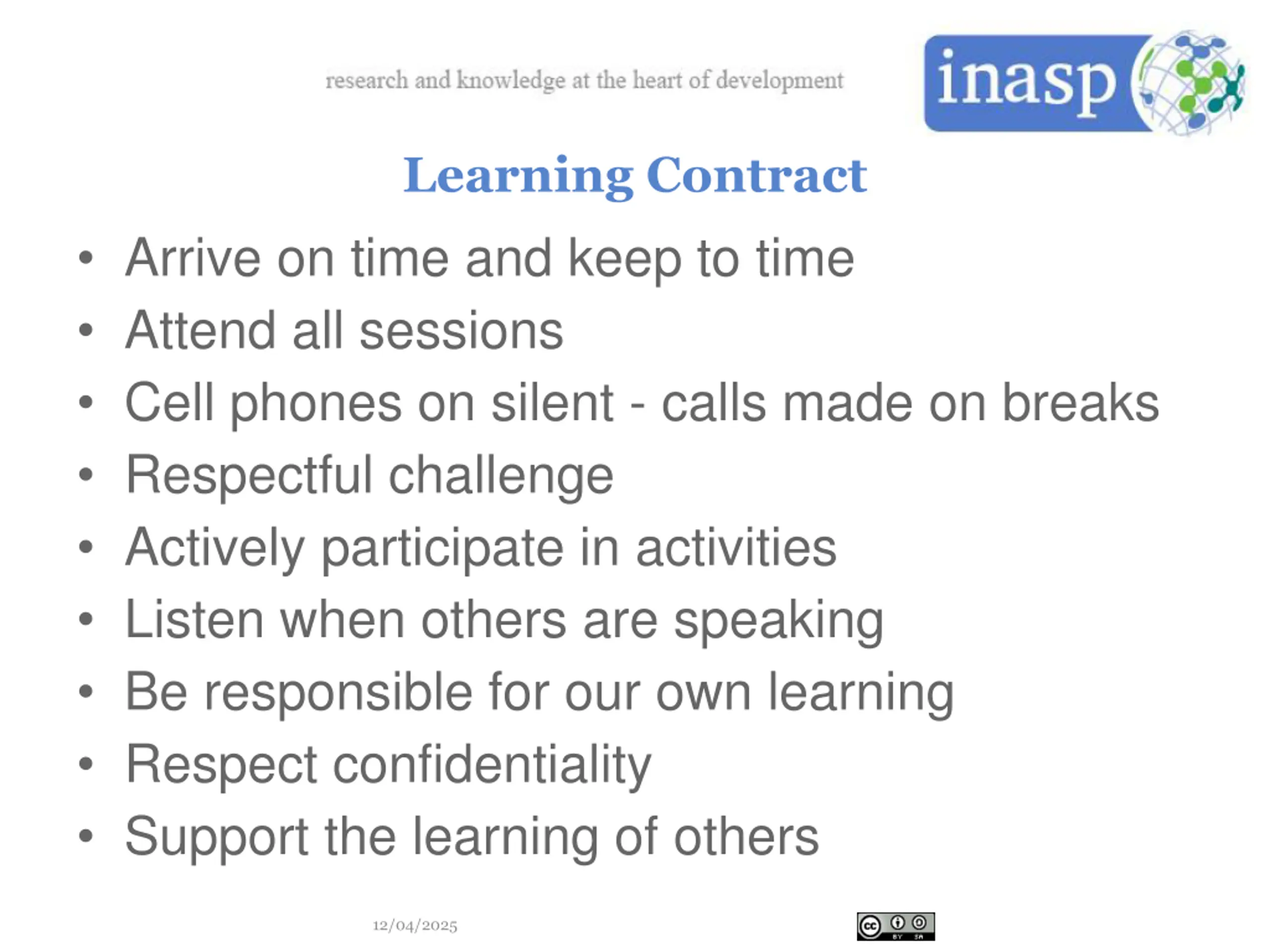 Learning Contract Arrive on time and keep to time Attend all sessions Cell phones on silent - calls made on breaks Respectful challenge Actively participate in activities Listen when others are speaking Be responsible for our own learning Respect confidentiality Support the learning of others 12/04/2025