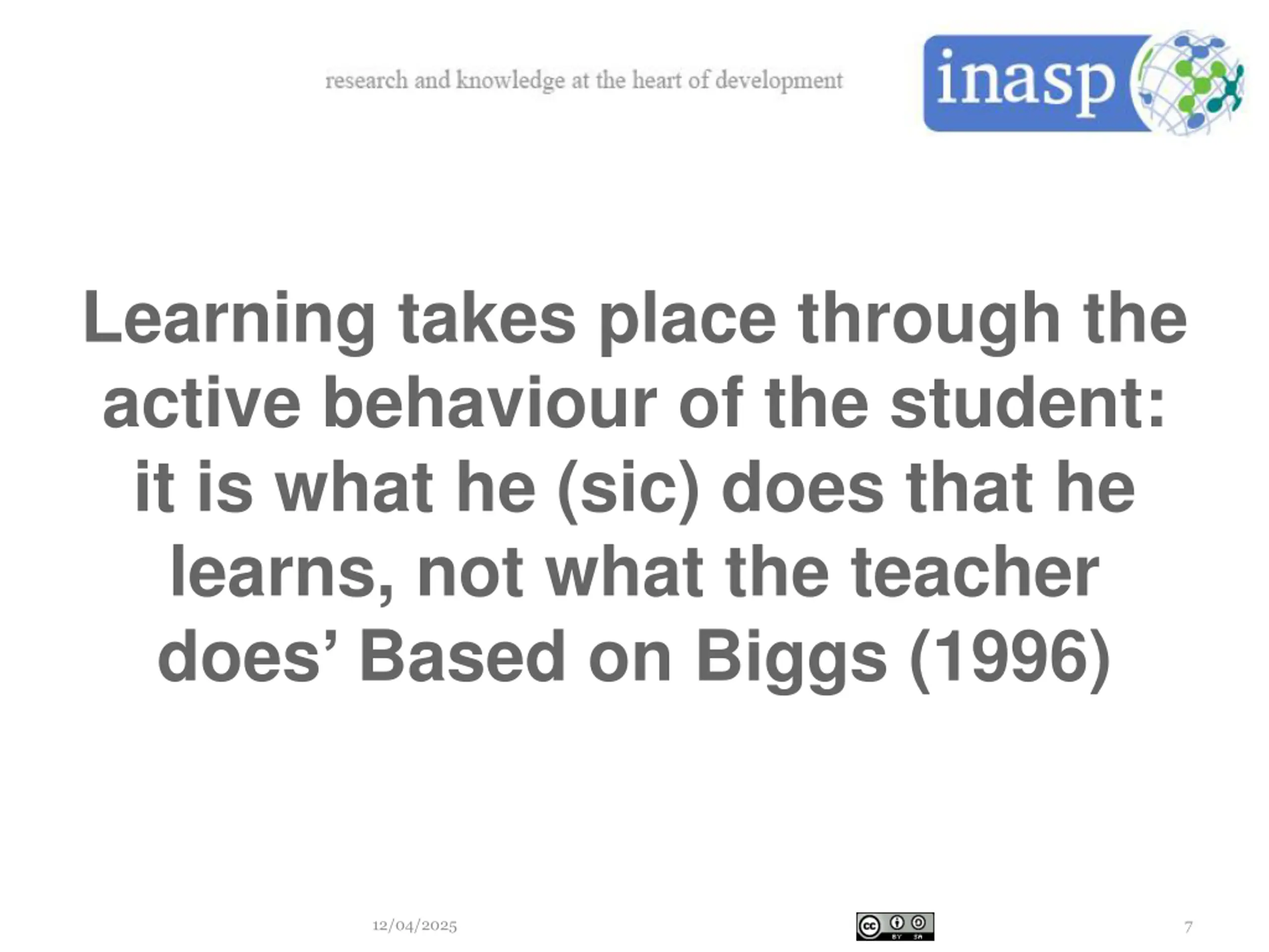 Learning takes place through the active behaviour of the student: it is what he (sic) does that he learns, not what the teacher does Based on Biggs (1996) 12/04/2025 7