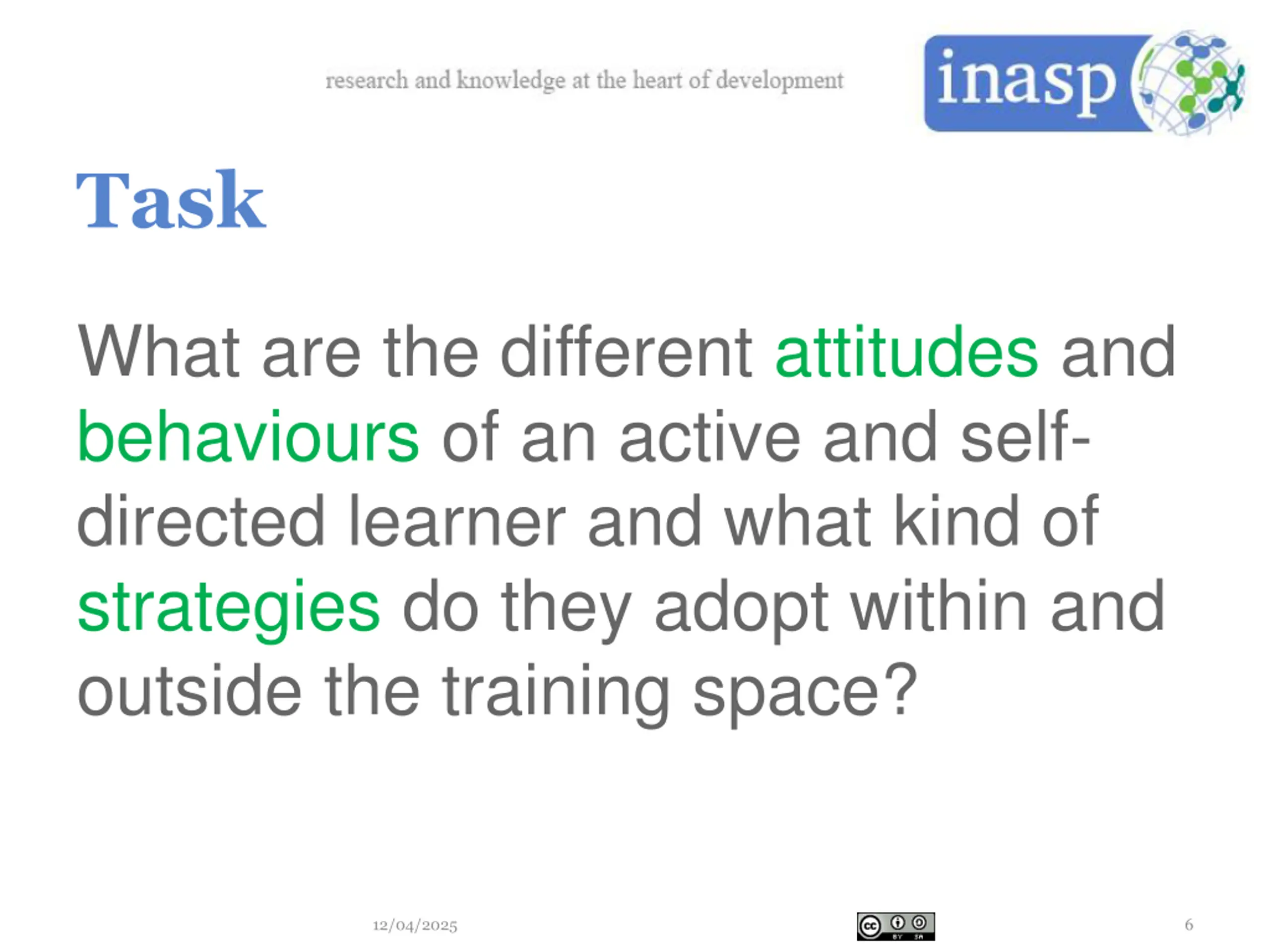 Task What are the different attitudes and behaviours of an active and self- directed learner and what kind of strategies do they adopt within and outside the training space? 12/04/2025 6