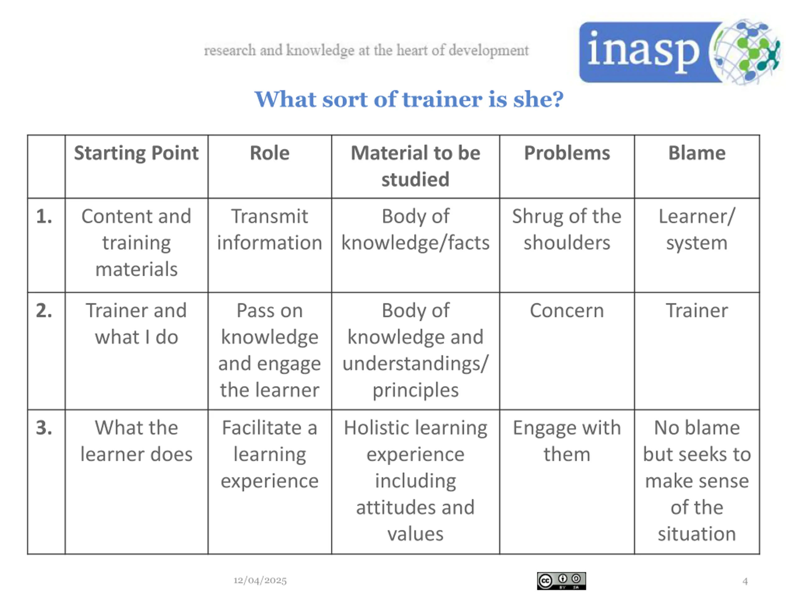 What sort of trainer is she? Starting Point Role Material to be studied Problems Blame 1. Content and training materials Transmit information Body of Shrug of the shoulders Learner/ system knowledge/facts 2. Trainer and what I do Pass on knowledge and engage the learner Body of knowledge and understandings/ principles Concern Trainer 3. What the learner does Facilitate a learning experience Holistic learning experience including attitudes and values Engage with them No blame but seeks to make sense of the situation 12/04/2025 4
