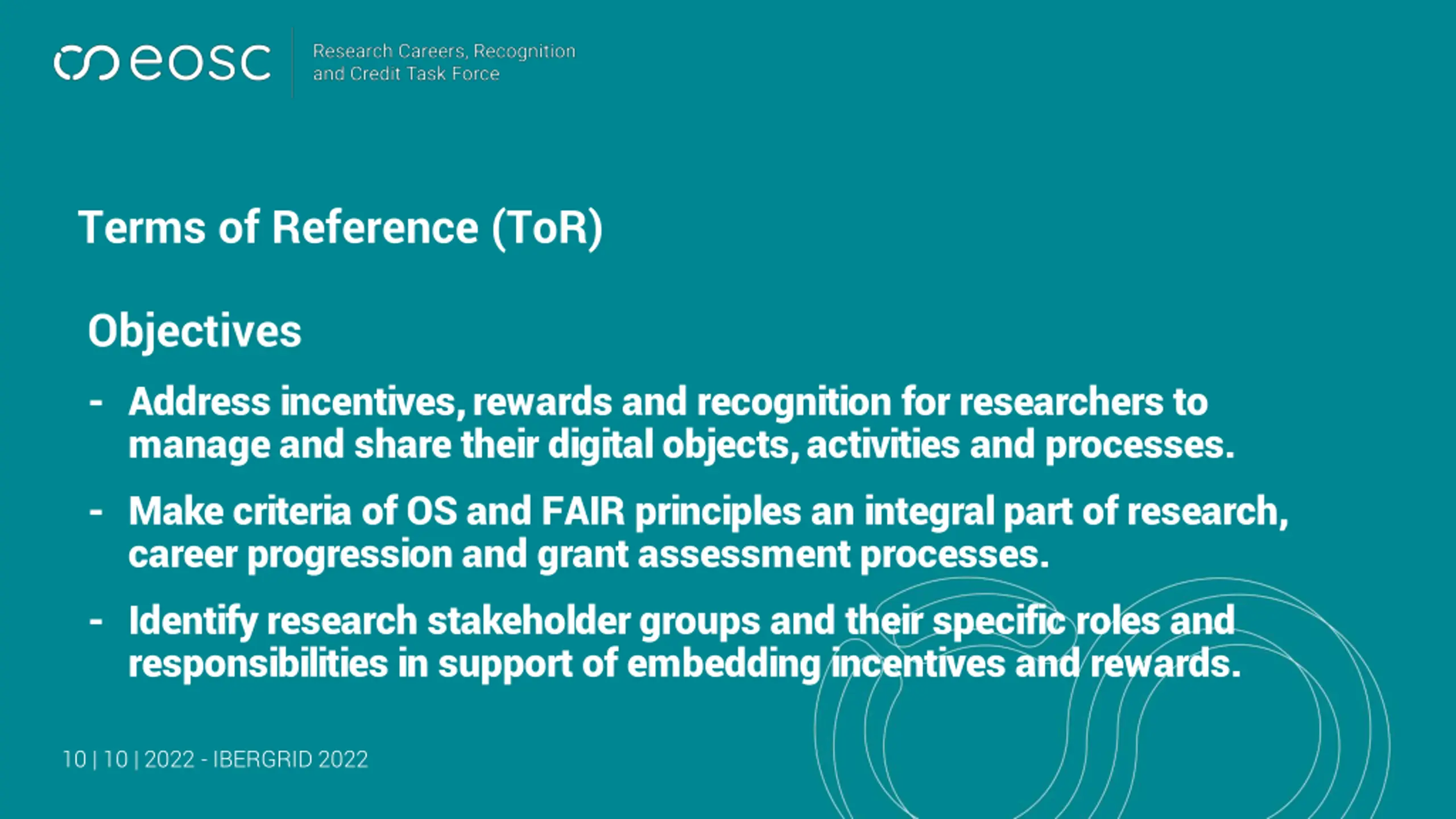 Terms of Reference (ToR) Objectives - Address incentives, rewards and recognition for researchers to manage and share their digital objects, activities and processes. - Make criteria of OS and FAIR principles an integral part of research, career progression and grant assessment processes. - Identify research stakeholder groups and their specific roles and responsibilities in support of embedding incentives and rewards. 10 | 10 | 2022 - IBERGRID 2022
