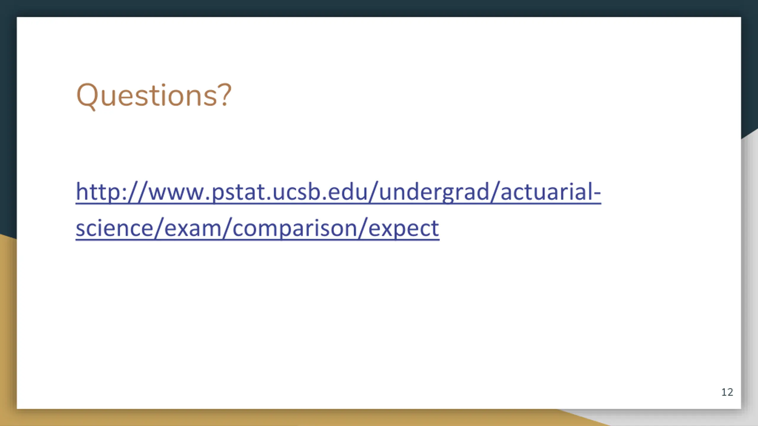 Questions? http://www.pstat.ucsb.edu/undergrad/actuarial- science/exam/comparison/expect 12