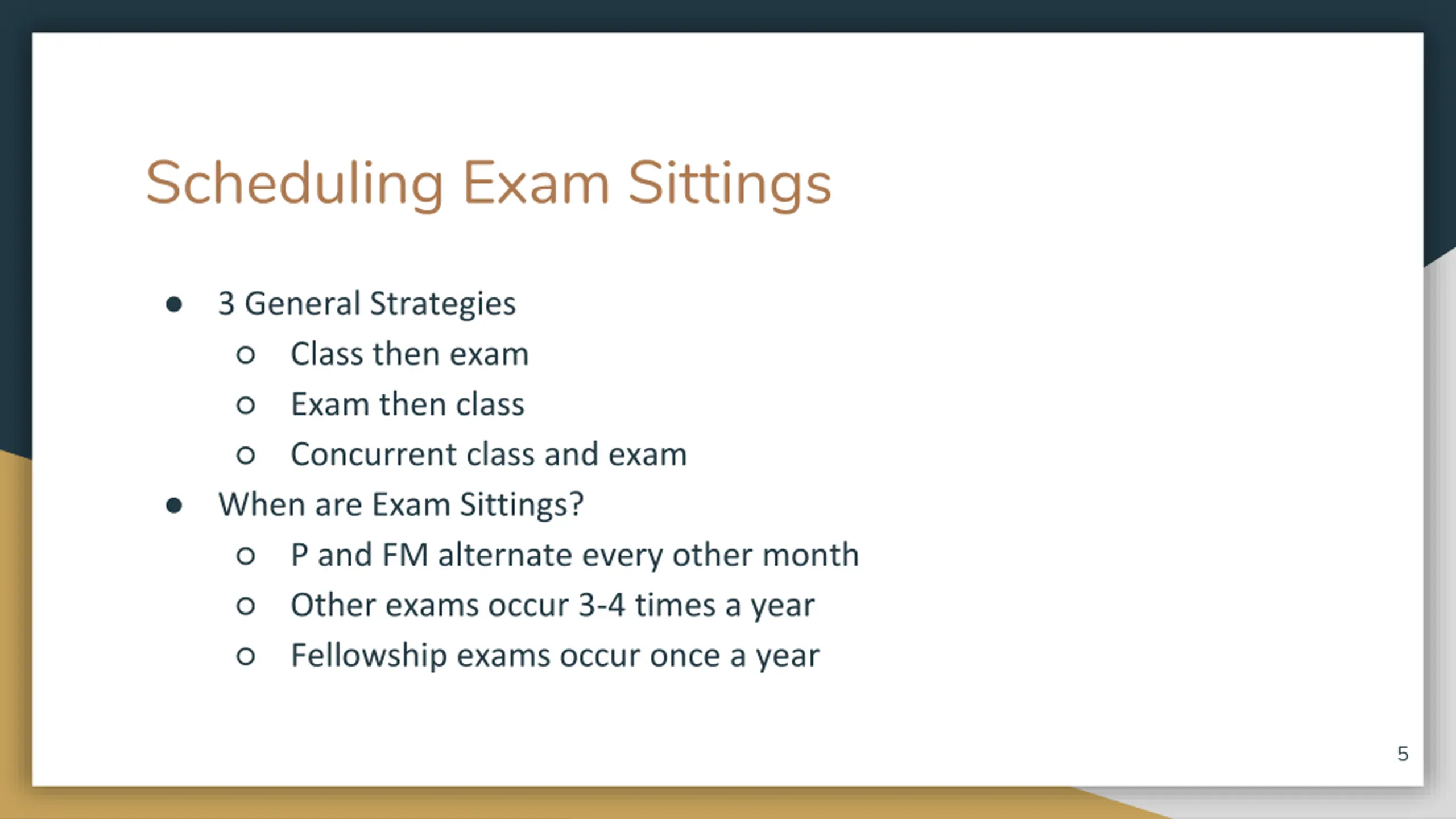 Scheduling Exam Sittings 3 General Strategies Class then exam Exam then class Concurrent class and exam When are Exam Sittings? P and FM alternate every other month Other exams occur 3-4 times a year Fellowship exams occur once a year 5
