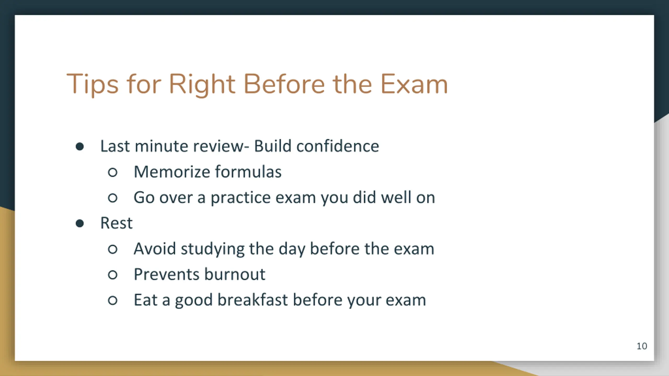 Tips for Right Before the Exam Last minute review- Build confidence Memorize formulas Go over a practice exam you did well on Rest Avoid studying the day before the exam Prevents burnout Eat a good breakfast before your exam 10
