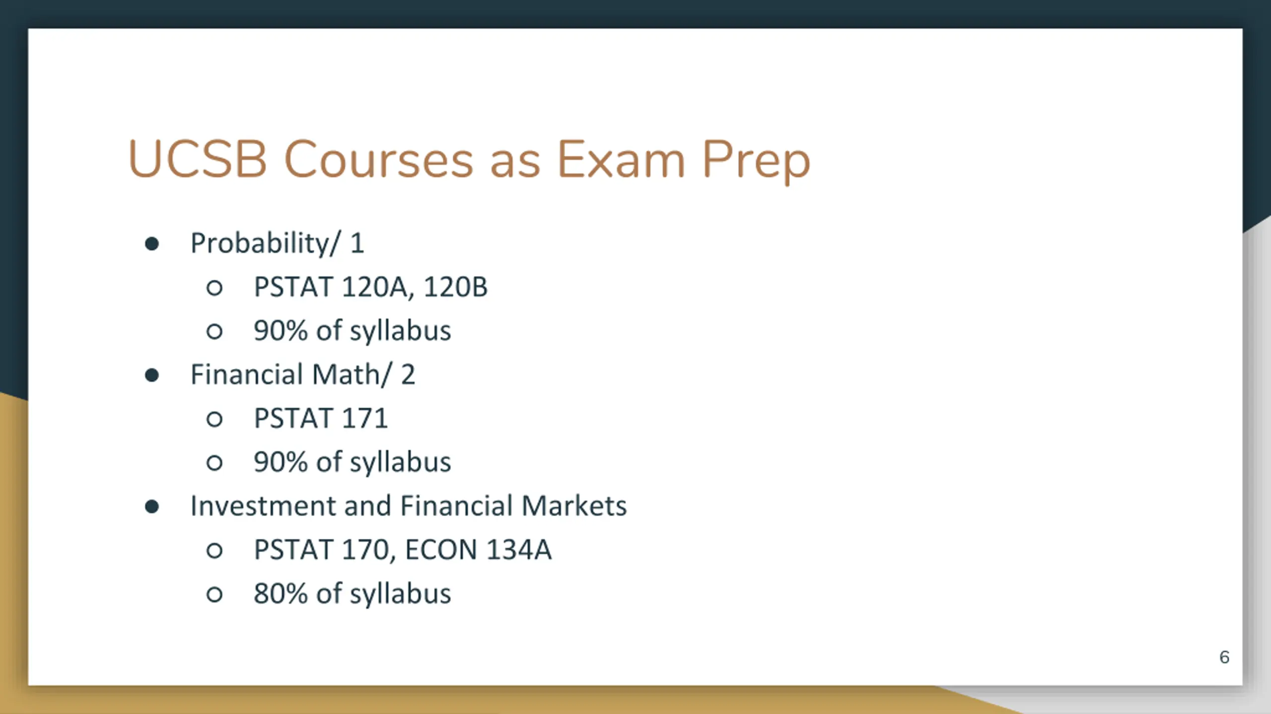 UCSB Courses as Exam Prep Probability/ 1 PSTAT 120A, 120B 90% of syllabus Financial Math/ 2 PSTAT 171 90% of syllabus Investment and Financial Markets PSTAT 170, ECON 134A 80% of syllabus 6