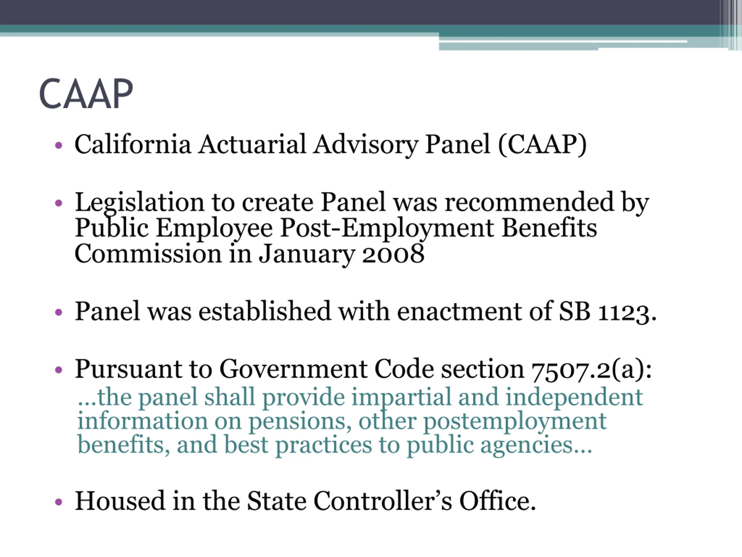 CAAP California Actuarial Advisory Panel (CAAP) Legislation to create Panel was recommended by Public Employee Post-Employment Benefits Commission in January 2008 Panel was established with enactment of SB 1123. Pursuant to Government Code section 7507.2(a): the panel shall provide impartial and independent information on pensions, other postemployment benefits, and best practices to public agencies Housed in the State Controller s Office.