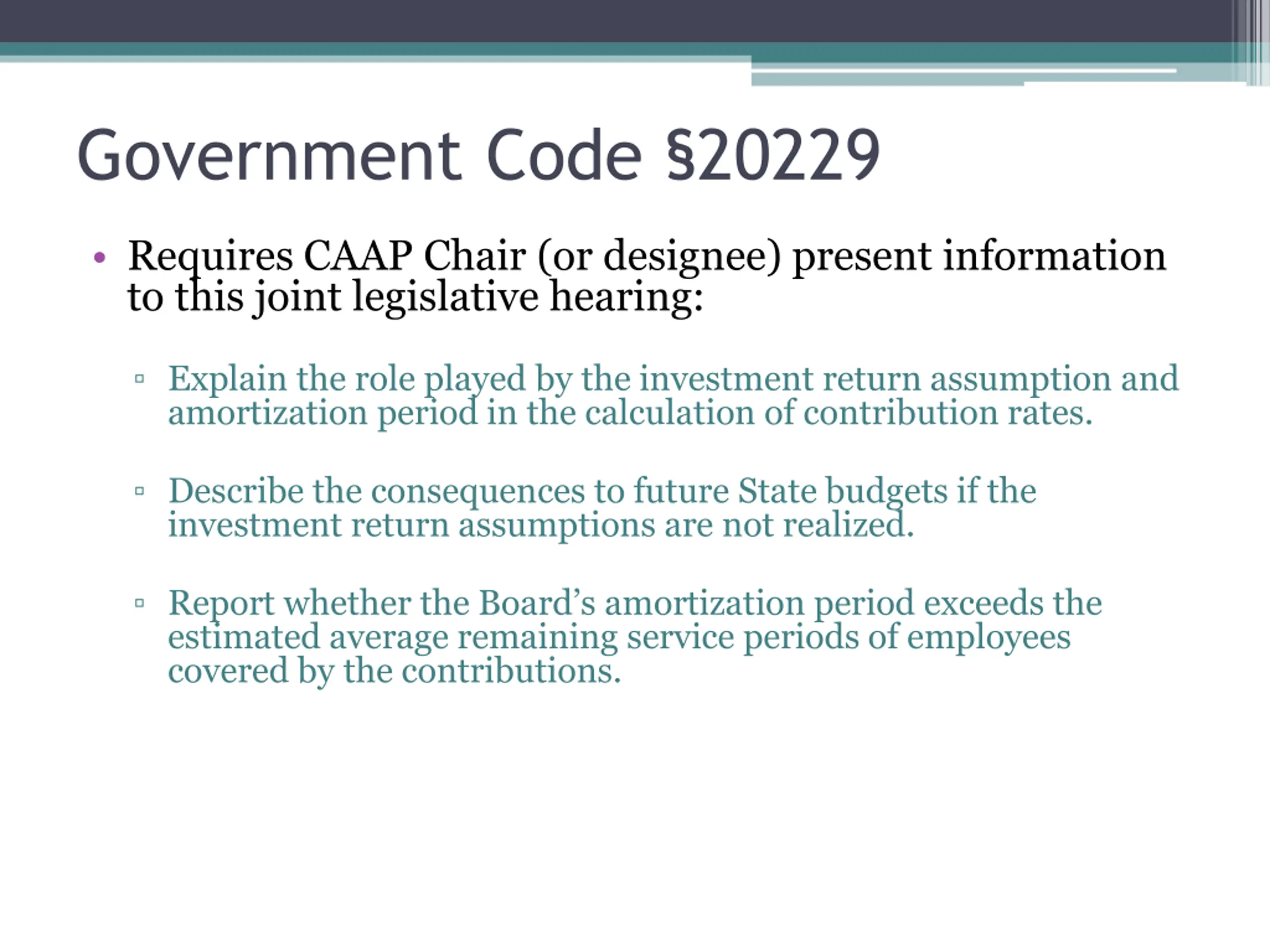 Government Code 20229 Requires CAAP Chair (or designee) present information to this joint legislative hearing: Explain the role played by the investment return assumption and amortization period in the calculation of contribution rates. Describe the consequences to future State budgets if the investment return assumptions are not realized. Report whether the Board s amortization period exceeds the estimated average remaining service periods of employees covered by the contributions.