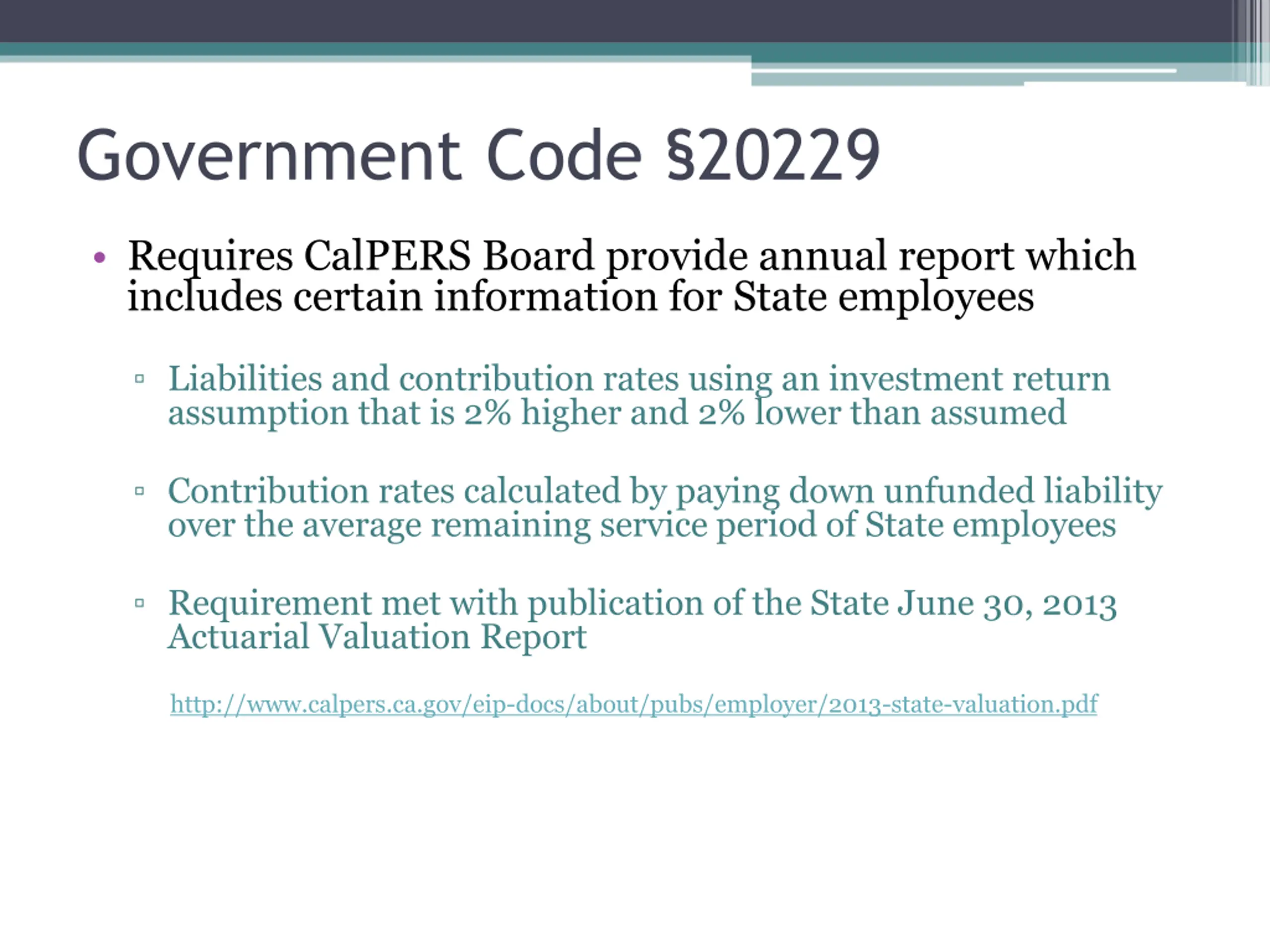 Government Code 20229 Requires CalPERS Board provide annual report which includes certain information for State employees Liabilities and contribution rates using an investment return assumption that is 2% higher and 2% lower than assumed Contribution rates calculated by paying down unfunded liability over the average remaining service period of State employees Requirement met with publication of the State June 30, 2013 Actuarial Valuation Report http://www.calpers.ca.gov/eip-docs/about/pubs/employer/2013-state-valuation.pdf