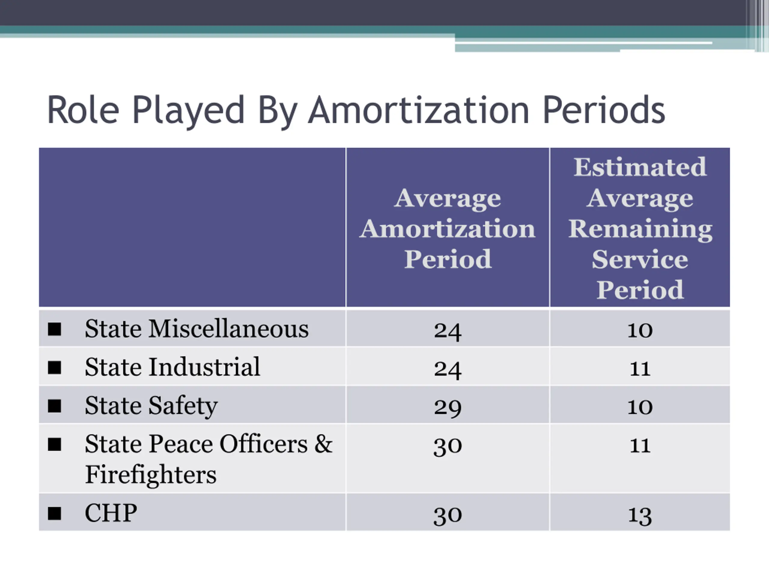 Role Played By Amortization Periods Estimated Average Remaining Service Period 10 11 10 11 Average Amortization Period State Miscellaneous State Industrial State Safety State Peace Officers & Firefighters CHP 24 24 29 30 30 13