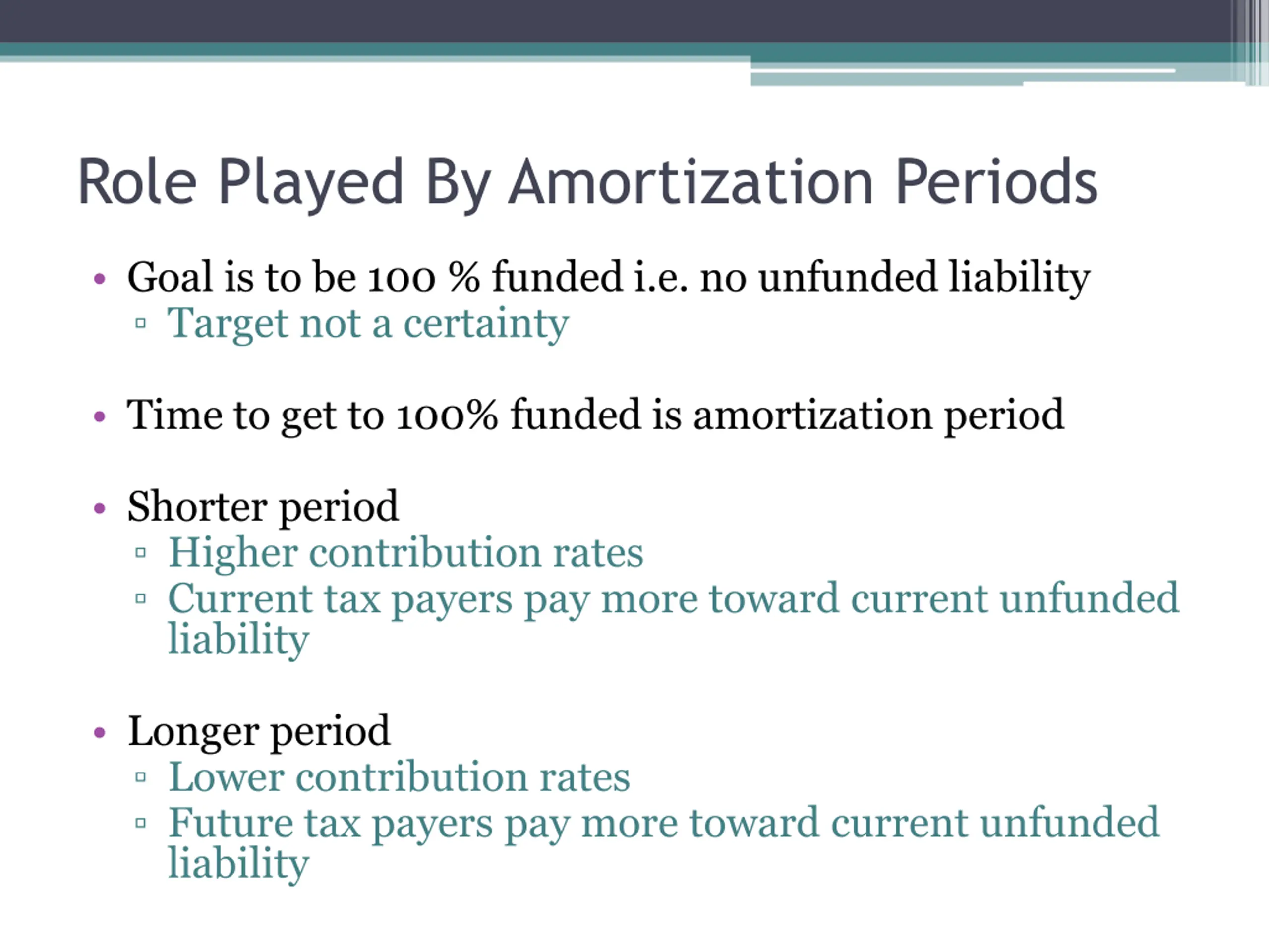 Role Played By Amortization Periods Goal is to be 100 % funded i.e. no unfunded liability Target not a certainty Time to get to 100% funded is amortization period Shorter period Higher contribution rates Current tax payers pay more toward current unfunded liability Longer period Lower contribution rates Future tax payers pay more toward current unfunded liability