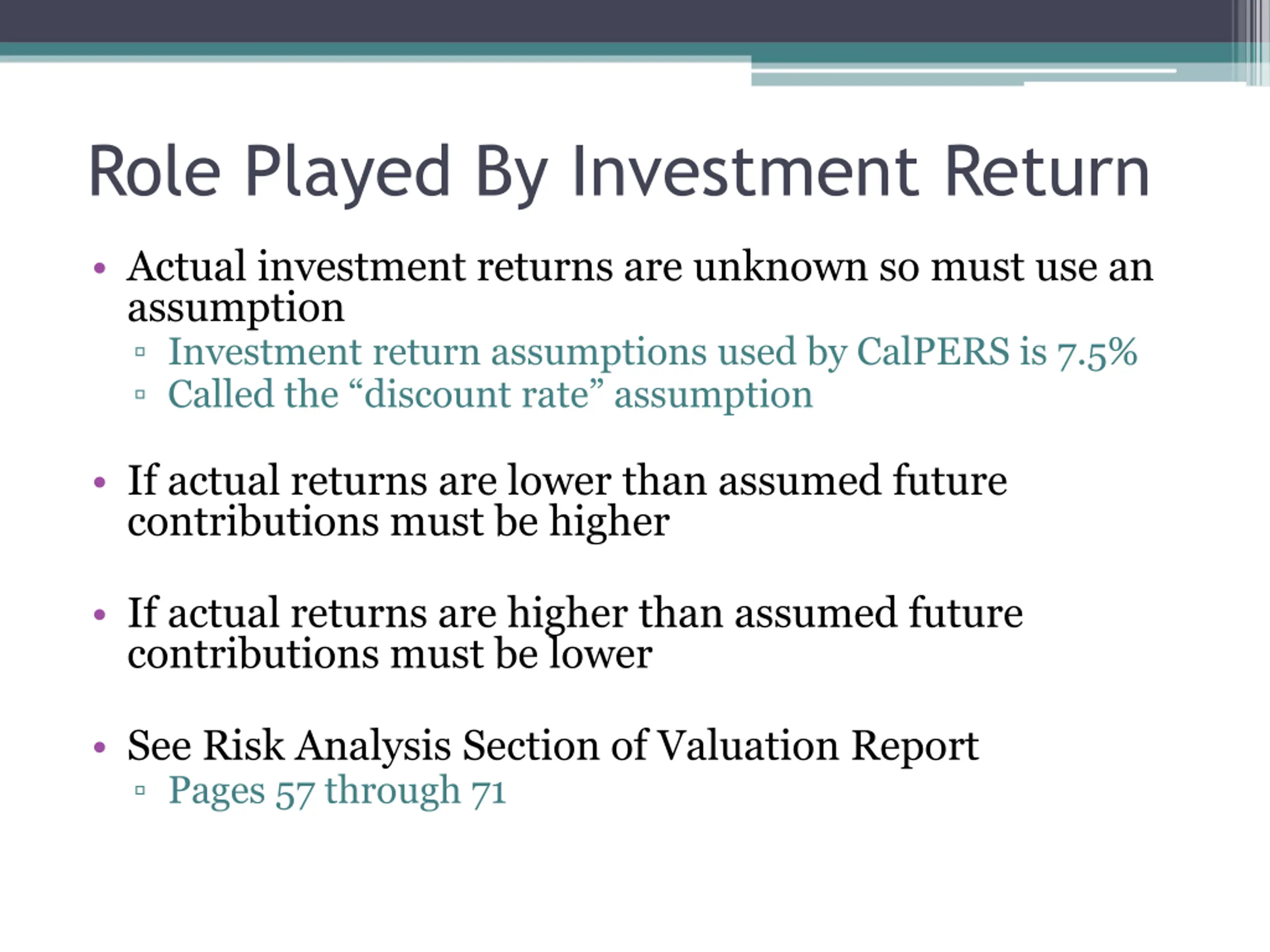 Role Played By Investment Return Actual investment returns are unknown so must use an assumption Investment return assumptions used by CalPERS is 7.5% Called the discount rate assumption If actual returns are lower than assumed future contributions must be higher If actual returns are higher than assumed future contributions must be lower See Risk Analysis Section of Valuation Report Pages 57 through 71