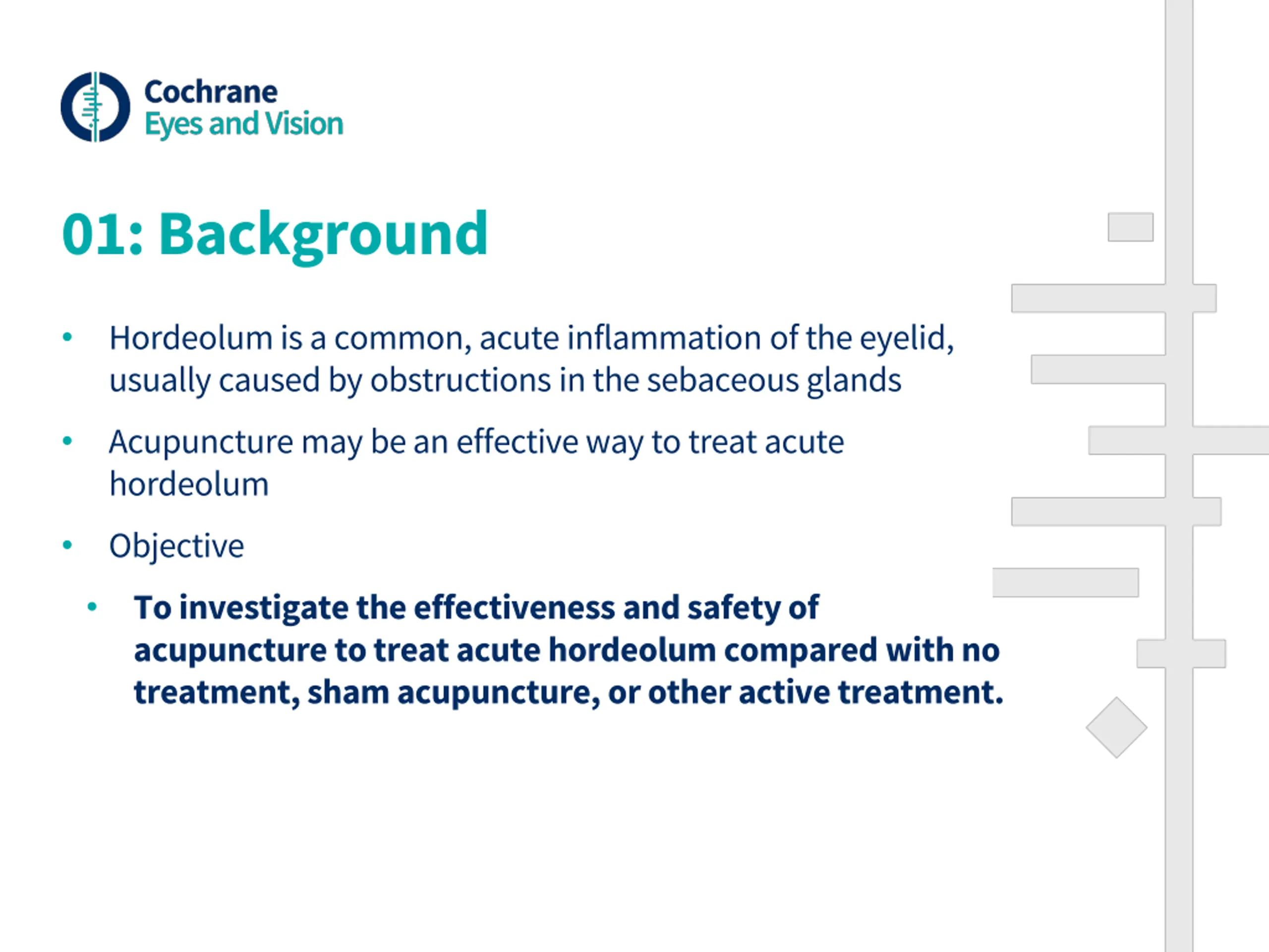 01: Background Hordeolumis a common, acute inflammation of the eyelid, usually caused by obstructions in the sebaceous glands Acupuncture may be an effective way to treat acute hordeolum Objective To investigate the effectiveness and safety of acupuncture to treat acute hordeolumcompared with no treatment, sham acupuncture, or other active treatment.