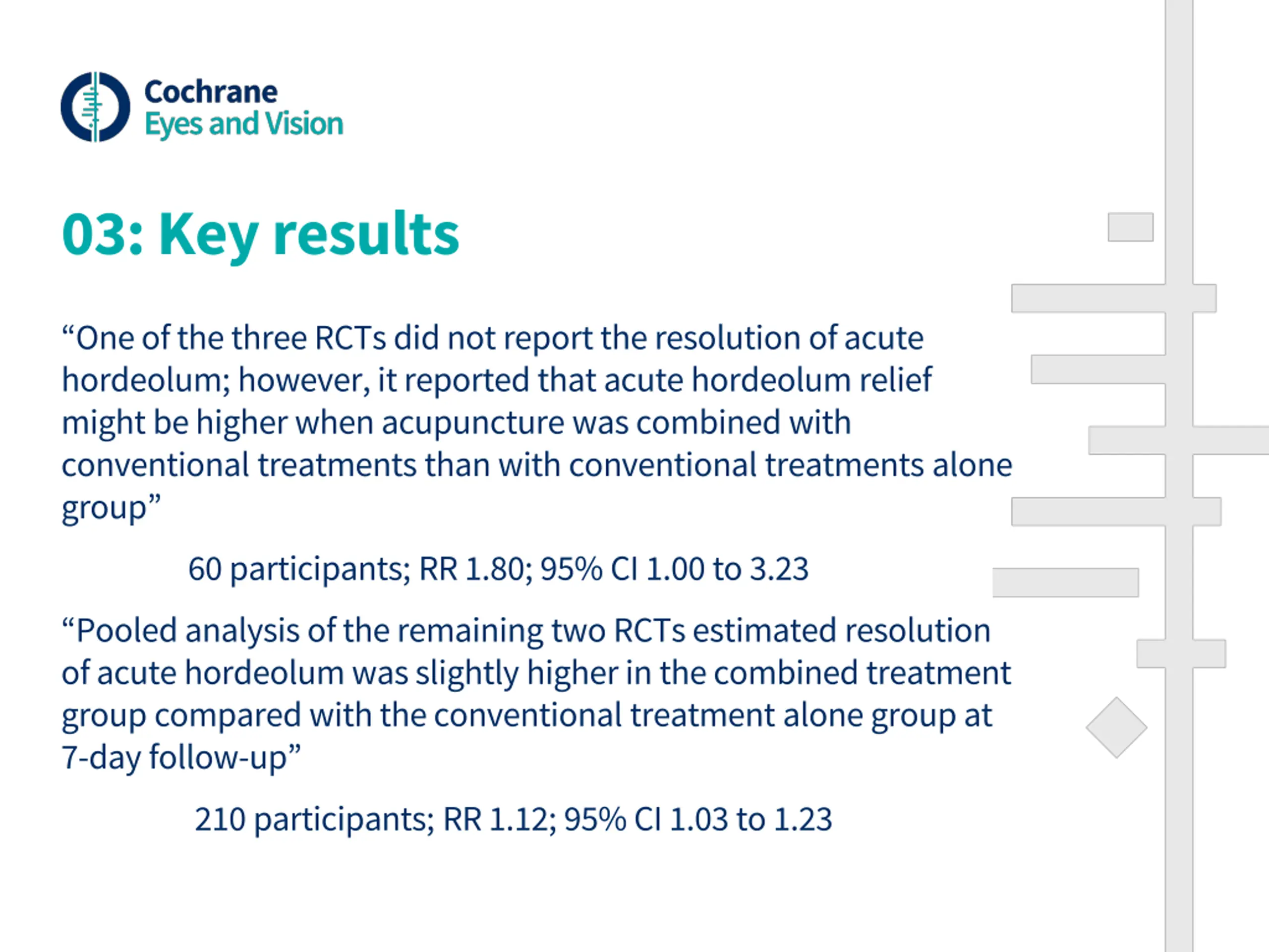 03: Key results One of the three RCTs did not report the resolution of acute hordeolum; however, it reported that acute hordeolumrelief might be higher when acupuncture was combined with conventional treatments than with conventional treatments alone group 60 participants; RR 1.80; 95% CI 1.00 to 3.23 Pooled analysis of the remaining two RCTs estimated resolution of acute hordeolumwas slightly higher in the combined treatment group compared with the conventional treatment alone group at 7-day follow-up 210 participants; RR 1.12; 95% CI 1.03 to 1.23