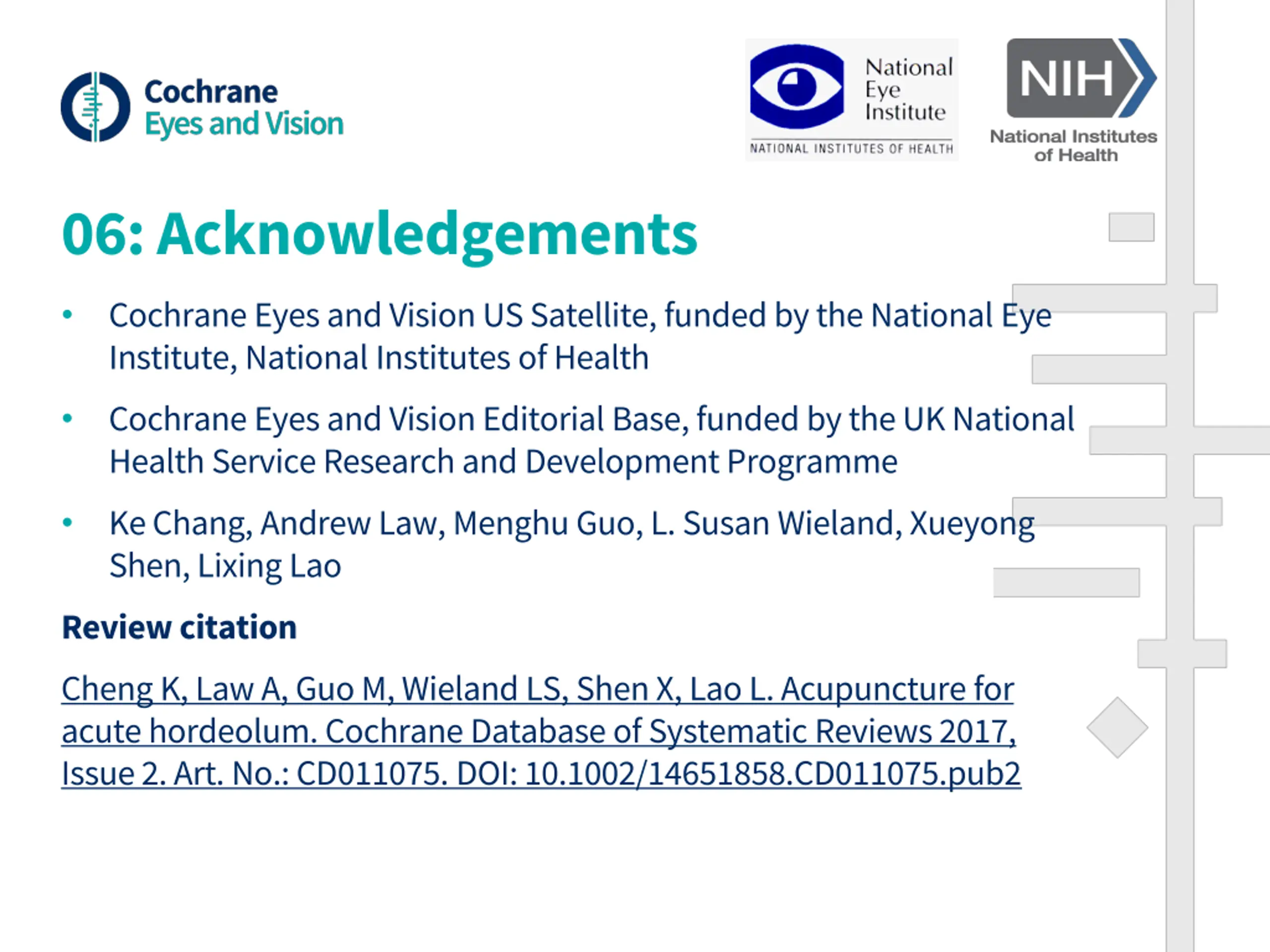 06: Acknowledgements Cochrane Eyes and Vision US Satellite, funded by the National Eye Institute, National Institutes of Health Cochrane Eyes and Vision Editorial Base, funded by the UK National Health Service Research and Development Programme KeChang, Andrew Law, MenghuGuo, L. Susan Wieland, Xueyong Shen, LixingLao Review citation Cheng K, Law A, GuoM, Wieland LS, Shen X, Lao L. Acupuncture for acute hordeolum. Cochrane Database of Systematic Reviews 2017, Issue 2. Art. No.: CD011075. DOI: 10.1002/14651858.CD011075.pub2