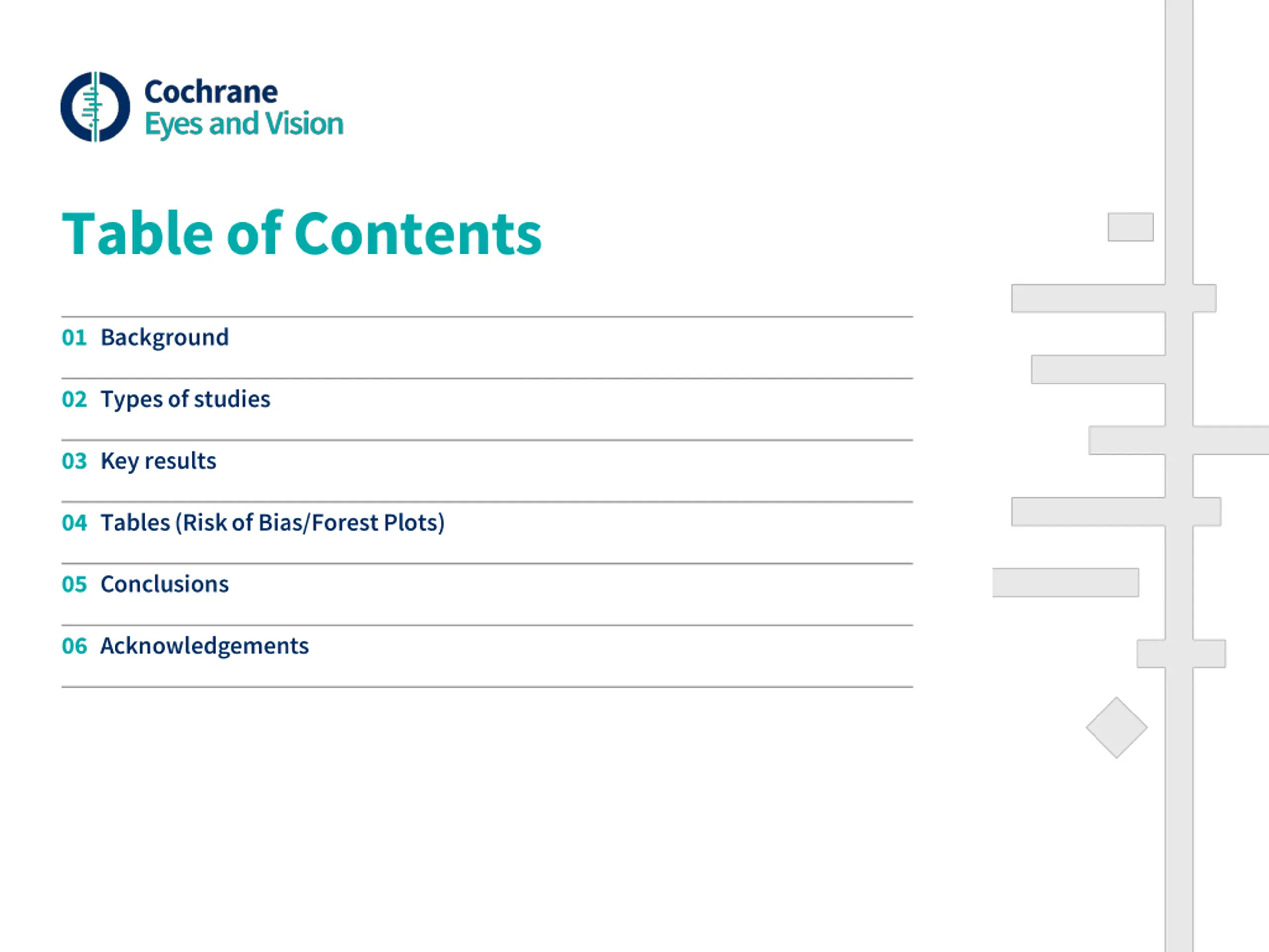 Table of Contents 01 Background 02 Typesof studies 03 Key results 04 Tables (Risk of Bias/Forest Plots) 05 Conclusions 06 Acknowledgements