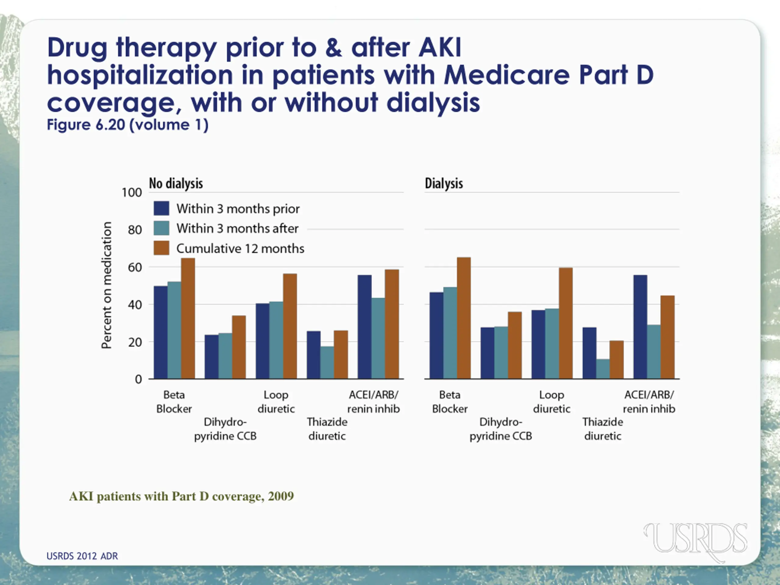 Drug therapy prior to & after AKI hospitalization in patients with Medicare Part D coverage, with or without dialysis Figure 6.20 (volume 1) AKI patients with Part D coverage, 2009 USRDS 2012 ADR