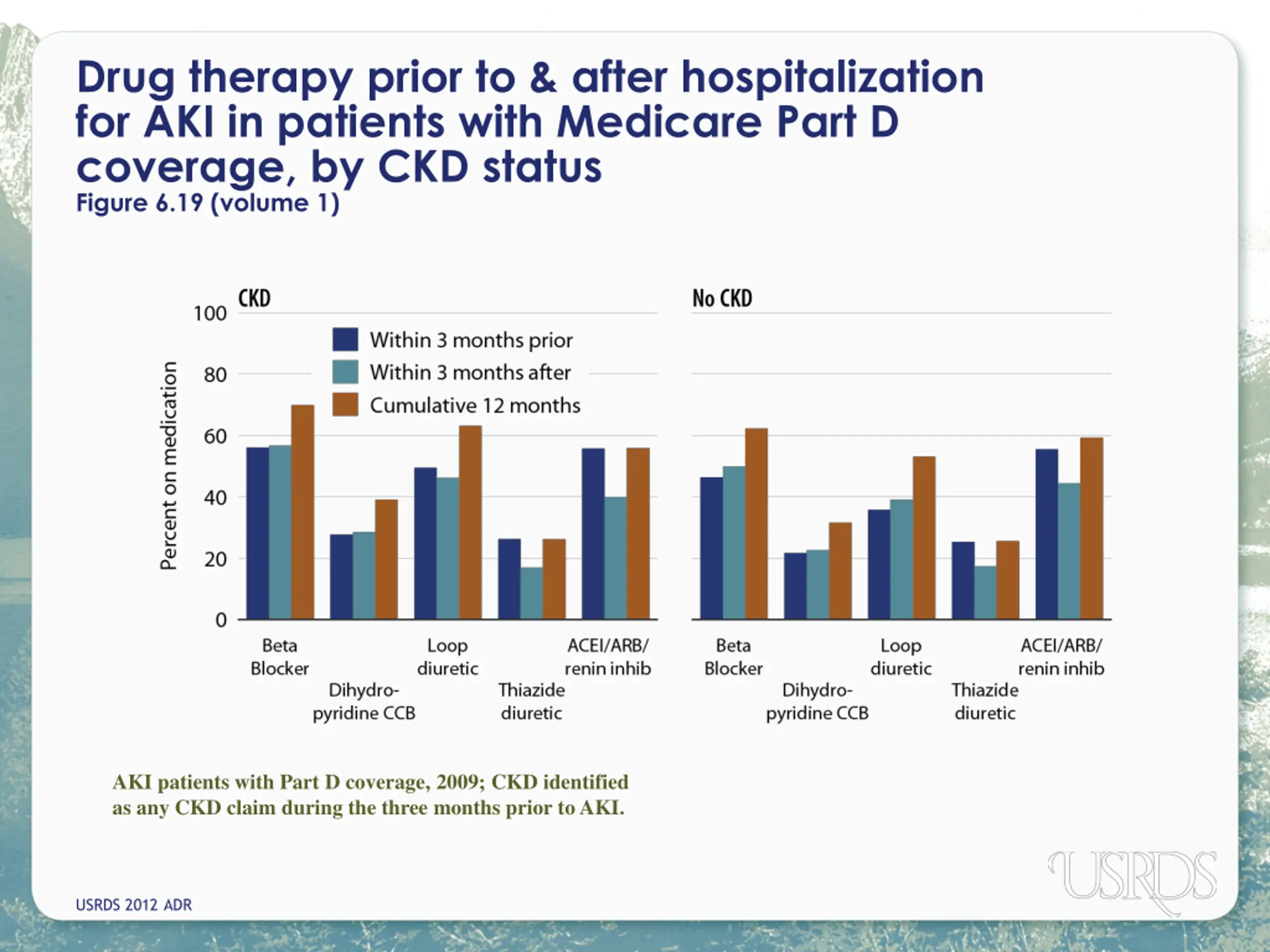 Drug therapy prior to & after hospitalization for AKI in patients with Medicare Part D coverage, by CKD status Figure 6.19 (volume 1) AKI patients with Part D coverage, 2009; CKD identified as any CKD claim during the three months prior to AKI. USRDS 2012 ADR