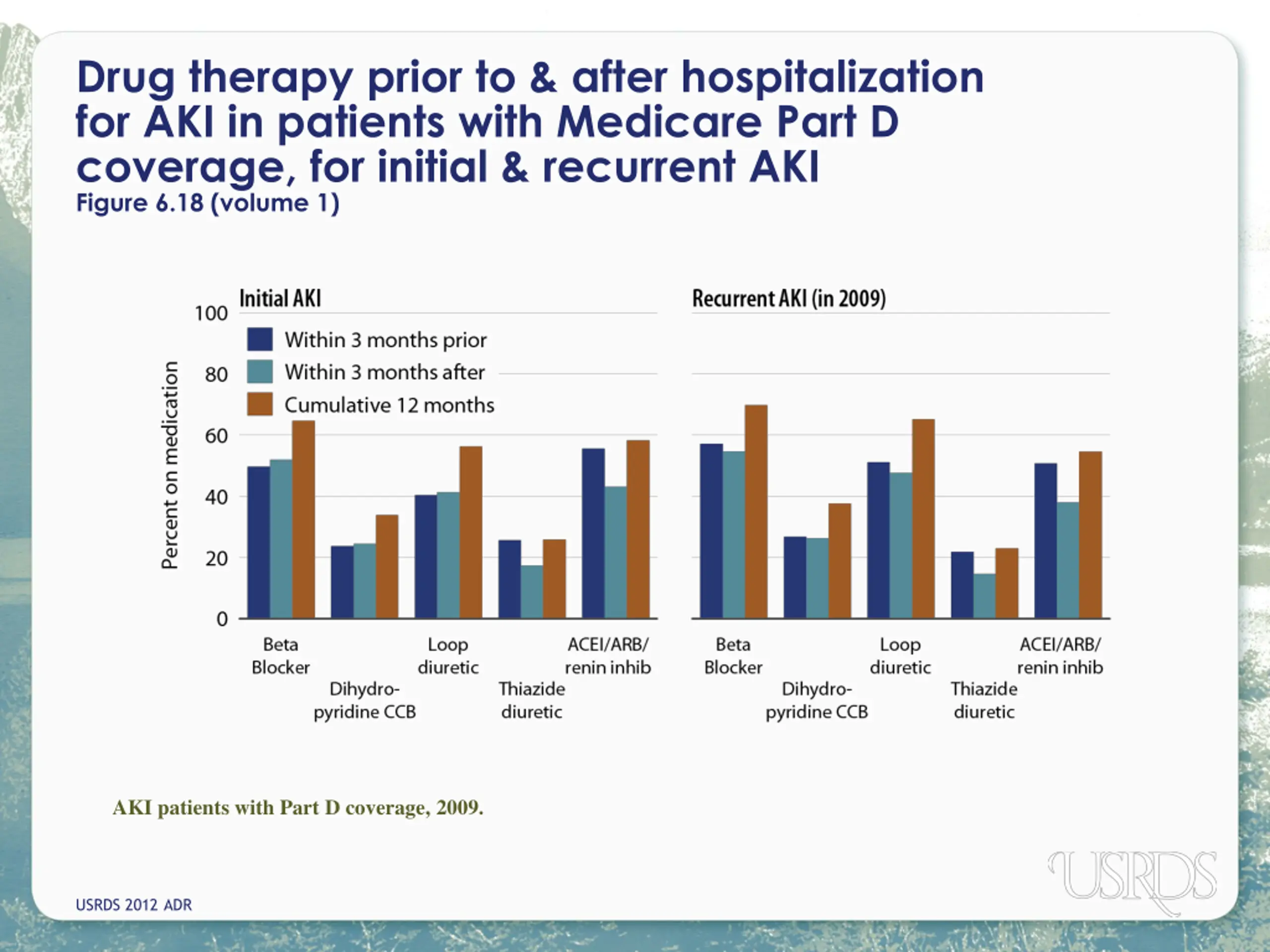 Drug therapy prior to & after hospitalization for AKI in patients with Medicare Part D coverage, for initial & recurrent AKI Figure 6.18 (volume 1) AKI patients with Part D coverage, 2009. USRDS 2012 ADR