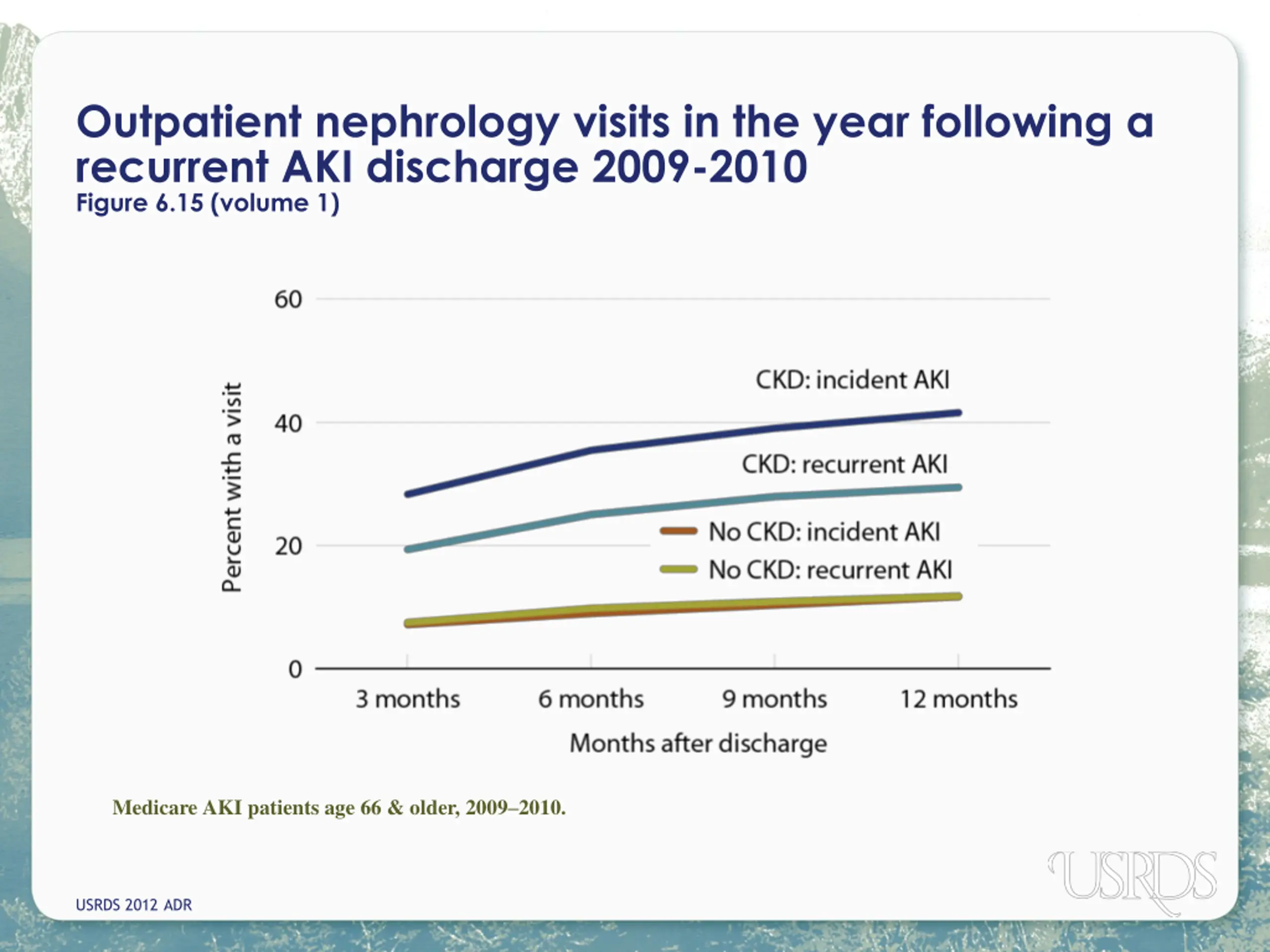 Outpatient nephrology visits in the year following a recurrent AKI discharge 2009-2010 Figure 6.15 (volume 1) Medicare AKI patients age 66 & older, 2009 2010. USRDS 2012 ADR