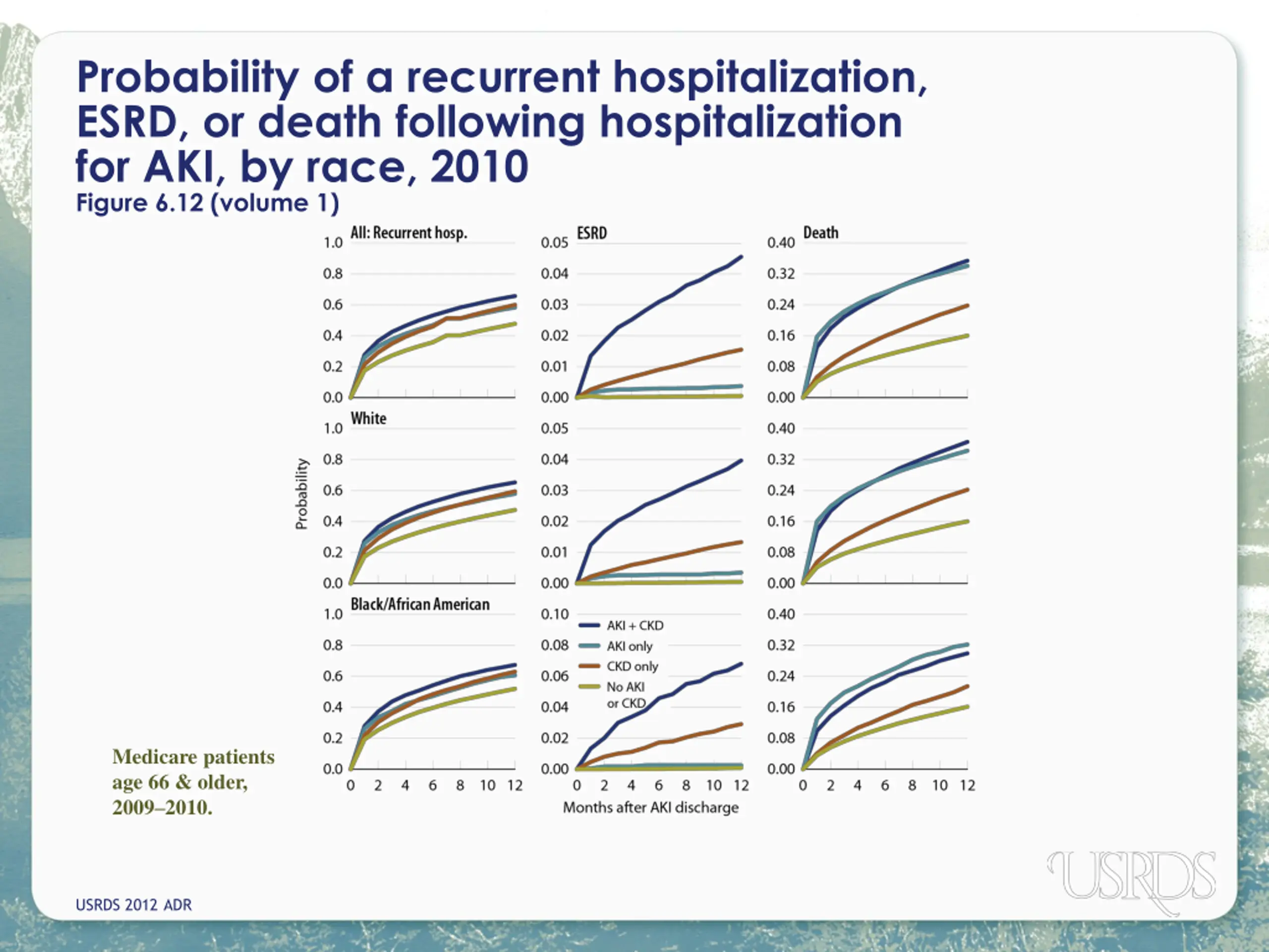 Probability of a recurrent hospitalization, ESRD, or death following hospitalization for AKI, by race, 2010 Figure 6.12 (volume 1) Medicare patients age 66 & older, 2009 2010. USRDS 2012 ADR