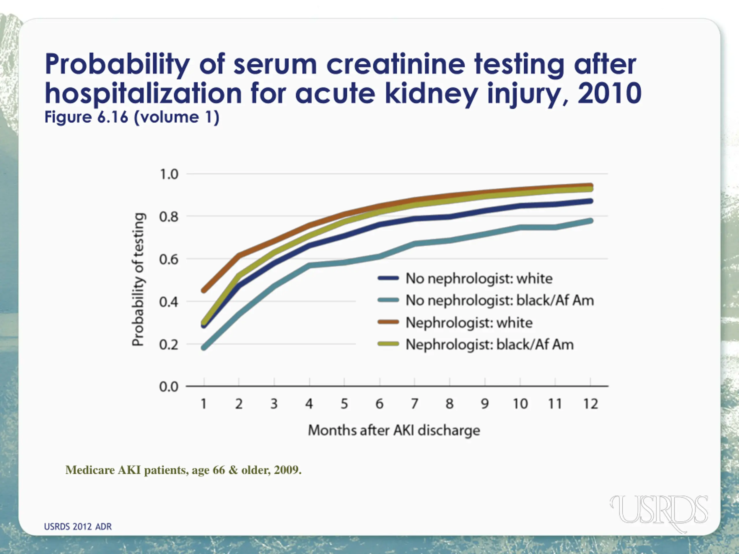 Probability of serum creatinine testing after hospitalization for acute kidney injury, 2010 Figure 6.16 (volume 1) Medicare AKI patients, age 66 & older, 2009. USRDS 2012 ADR