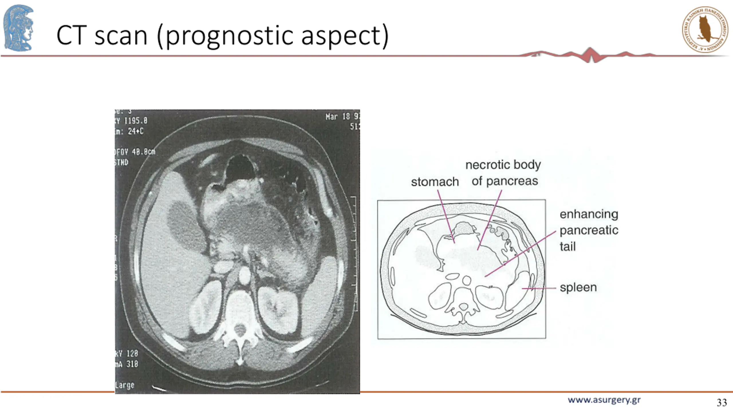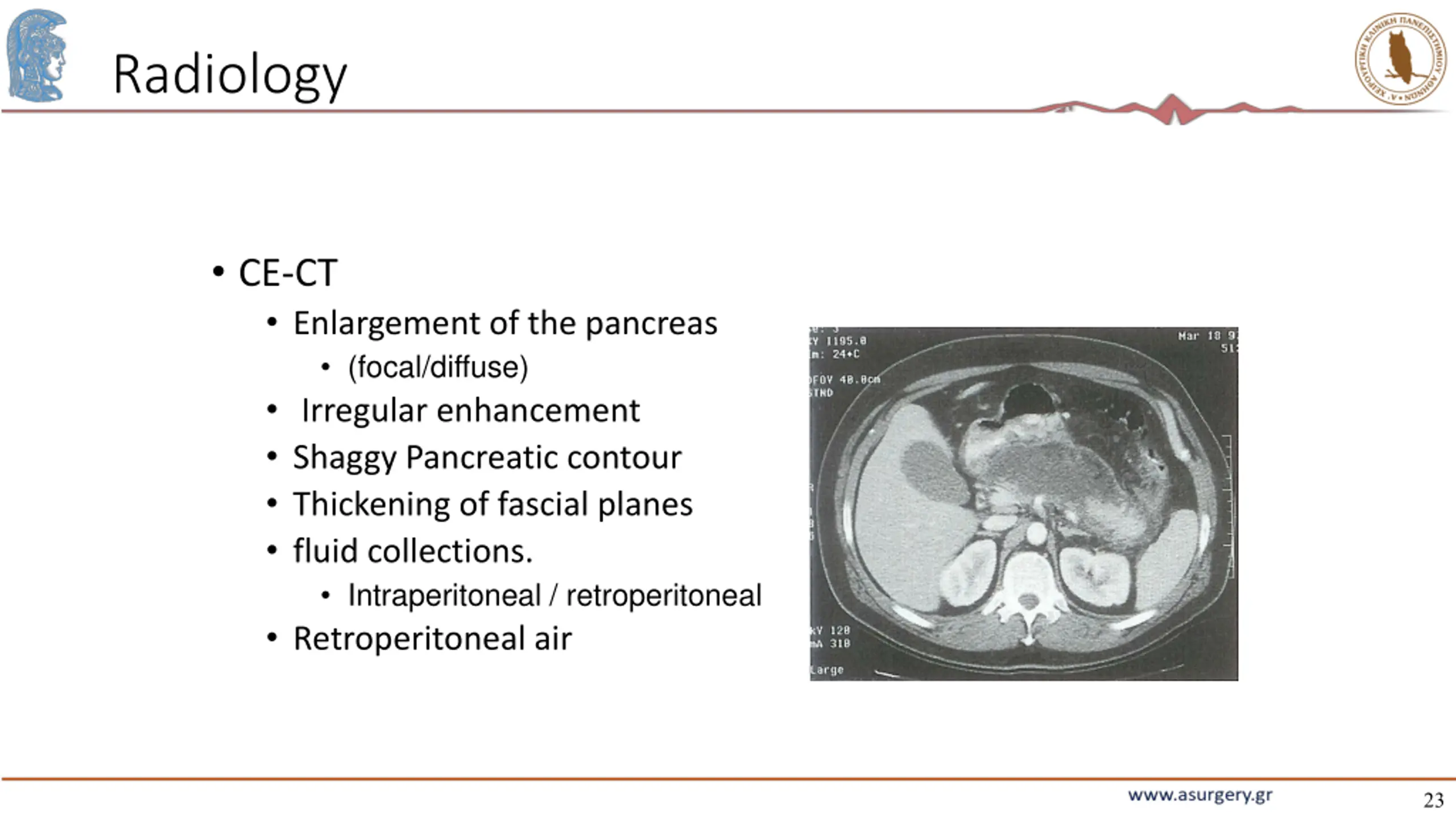 Radiology CE-CT Enlargement of the pancreas (focal/diffuse) Irregular enhancement Shaggy Pancreatic contour Thickening of fascial planes fluid collections. Intraperitoneal / retroperitoneal Retroperitoneal air 23